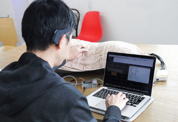 相原 今回は、マッサージ屋さんにおいて、お客さんが揉んでほしいところを脳波で伝えること、感じ方をお客さんとマッサージ師との間で共有することによる施術の納得感を目指しました。まずは、これを実際に実現し、マッサージ屋さんへ貸し出すことで収益を得られればと考えています。また、タオルで触った場所の感じ方を、視覚化した脳波でコミュニケーションするというアイディアは、様々な場面で利用できると考えています。例えば、体が不自由で思うように感じ方を伝えられない方の補助ツールのように、社会福祉の分野でも活用できたらと考えています。