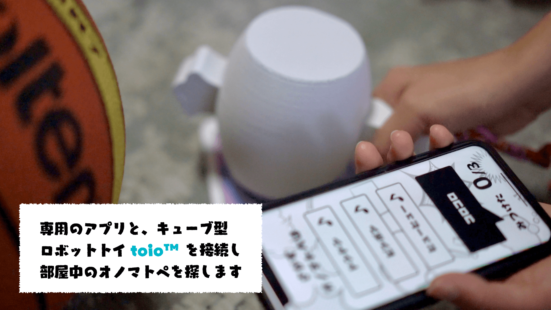 例題として指示される \\"オノマトペ\\" を、小槌(toio内臓)を持って探しにいきます。