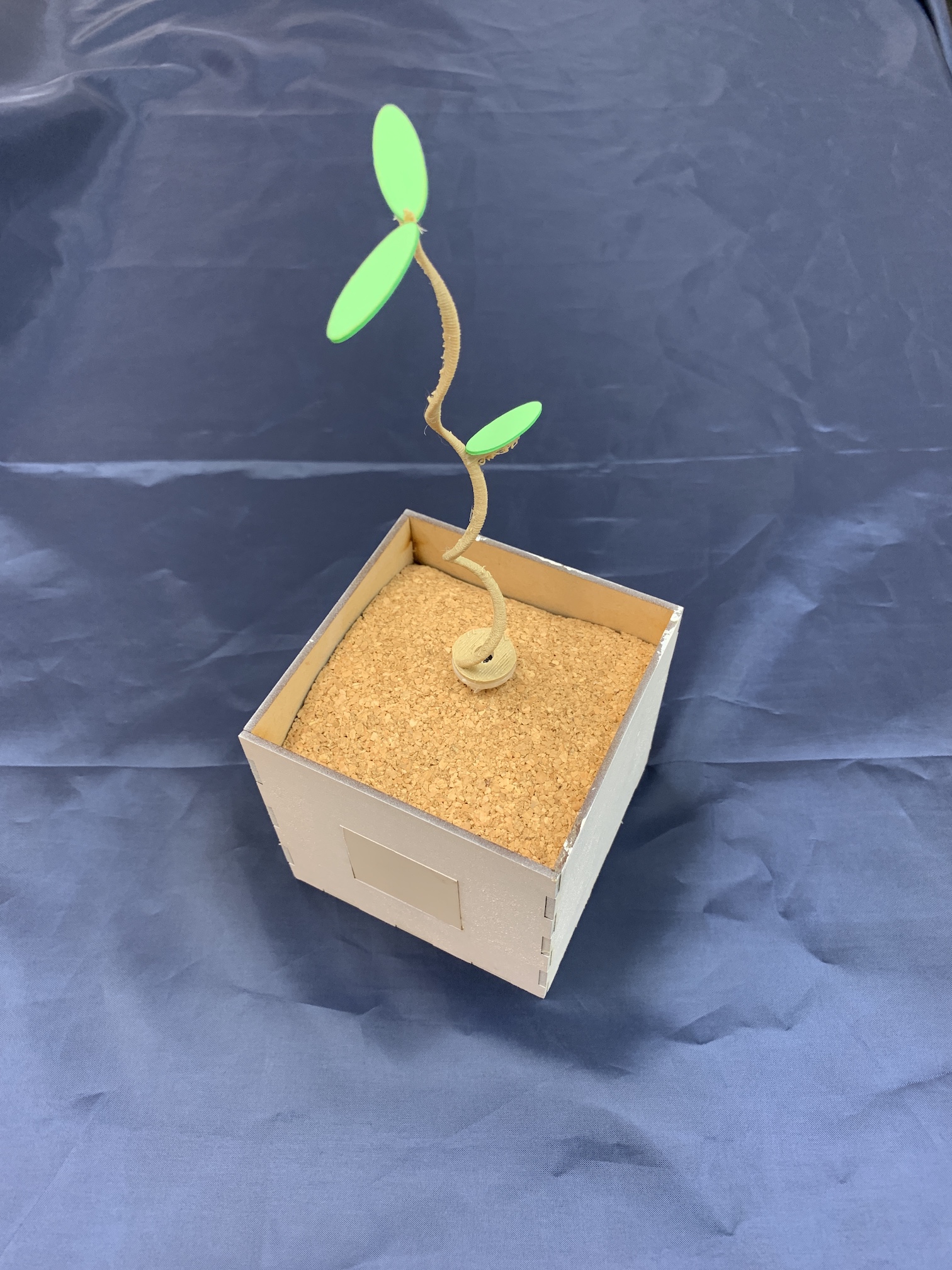 Power of Touchは手のひらの熱で作品を温めることで上部の植物が動き出す作品です。ペルチェ素子を温めることで電流を発生させ、その電流をセンシングし、一定以上温められるとモーターによって植物が回り始めます。
