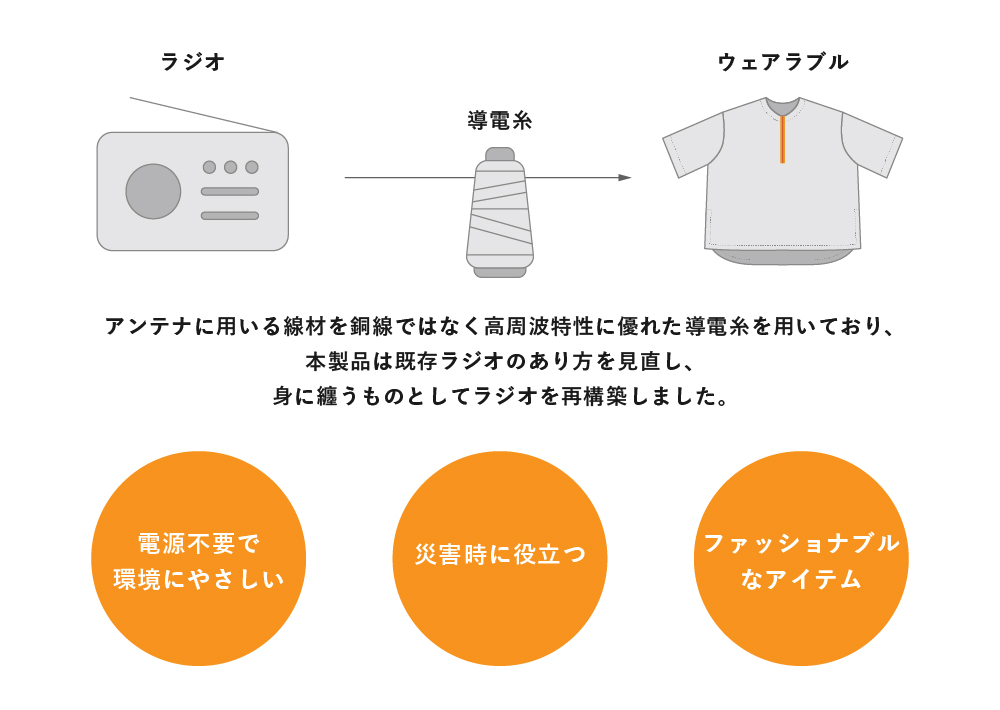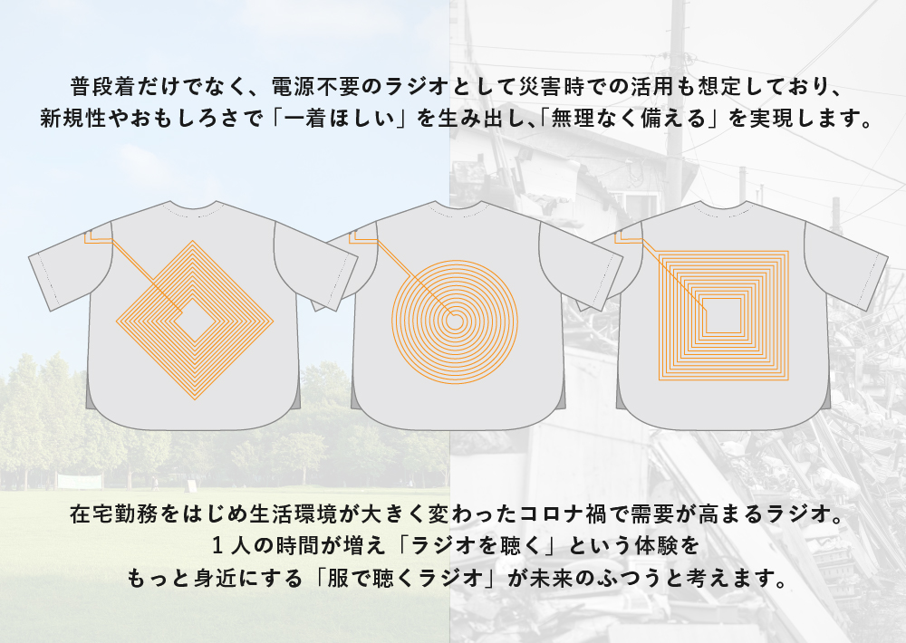 普段着だけでなく、電源不要のラジオとして災害時での活用も検討しており、