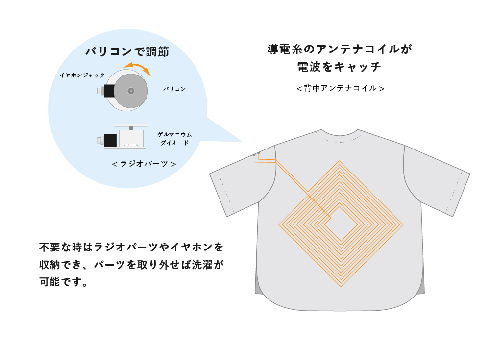 ラジオパーツはスナップボタンで取り外しができ、洗濯可能かつ普段着としても着用できます。