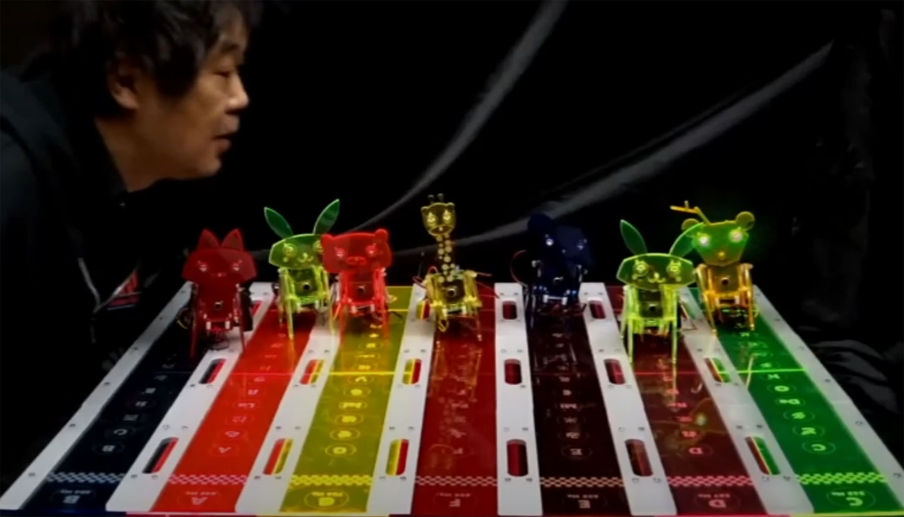 ミュージックダービーは、楽器の演奏で7体のロボットを動かしてレースをするゲームです。 ゲームの参加者は、曲の演奏が終わったときにどのロボットが一番遠くまで動いているかを予想します。 鹿やウサギ、ネズミの形をした4足歩行のロボットのそれぞれに、特定の音が割り当てられています。 たとえば、ドの音は鹿に、レの音はウサギに、ミの音はネズミに割り当てられています。 ソの音が演奏されると、豚が前進します。 ファの音が演奏されると、キリンが前進します。 ミの音が演奏されるとネズミが進みます。 もし、キラキラ星がハ長調で演奏されると、曲の終了時にどの動物が一番遠くまで進んでいるでしょうか? ハ長調ではドの音が主音ですから、ドが割り当てられた鹿が一番遠くまで進むと思うかもしれません。 しかし、実際は、ソが割り当てられた豚が勝利します。 なぜならば、キラキラ星でもっとも頻度が高い音は、ソだからです。 対照的に、猫はまったく動きません。なぜならシの音は使われていないからです。 ミュージックダービーは、音階中の音の出現頻度を視覚化することができます。