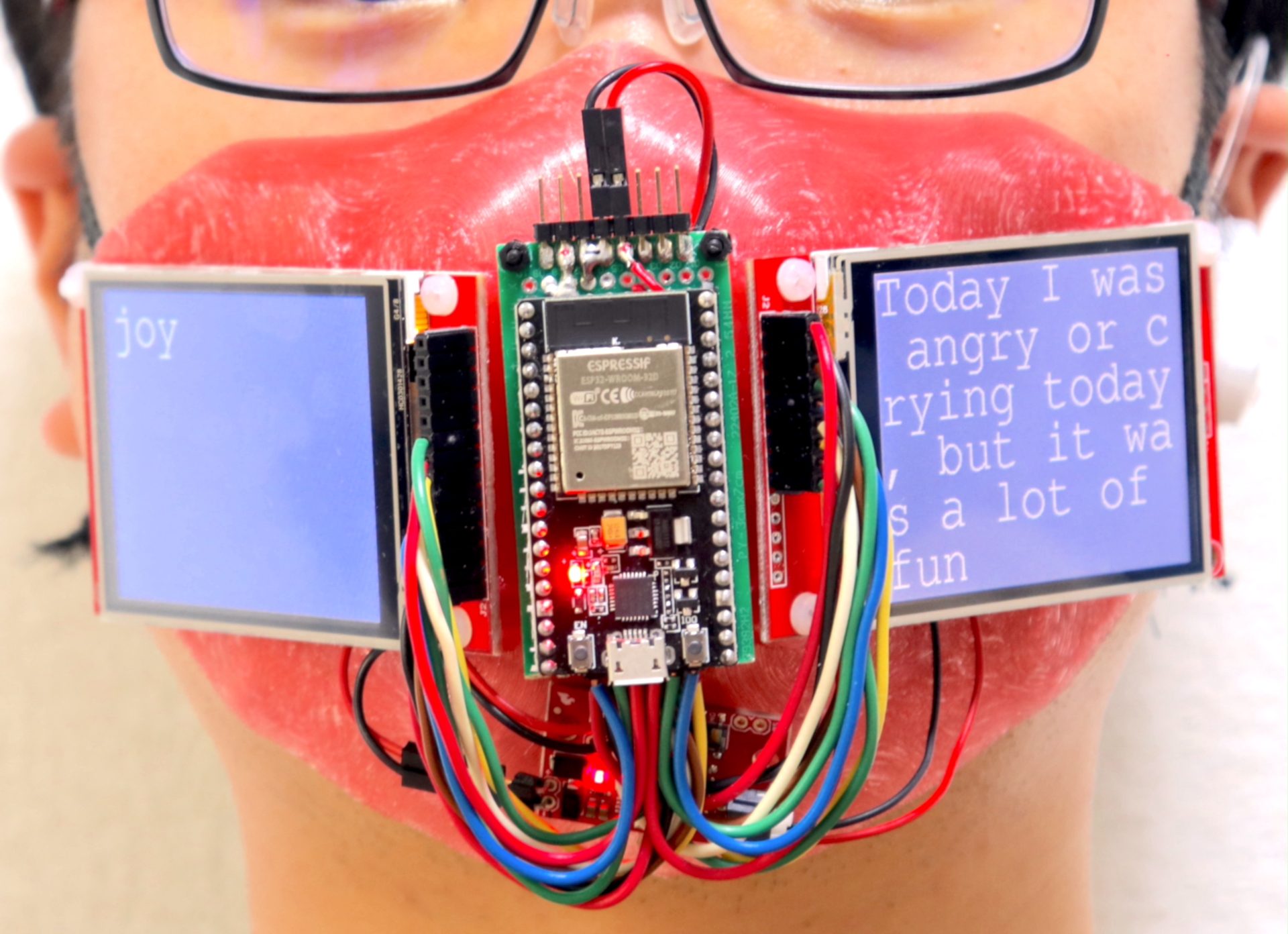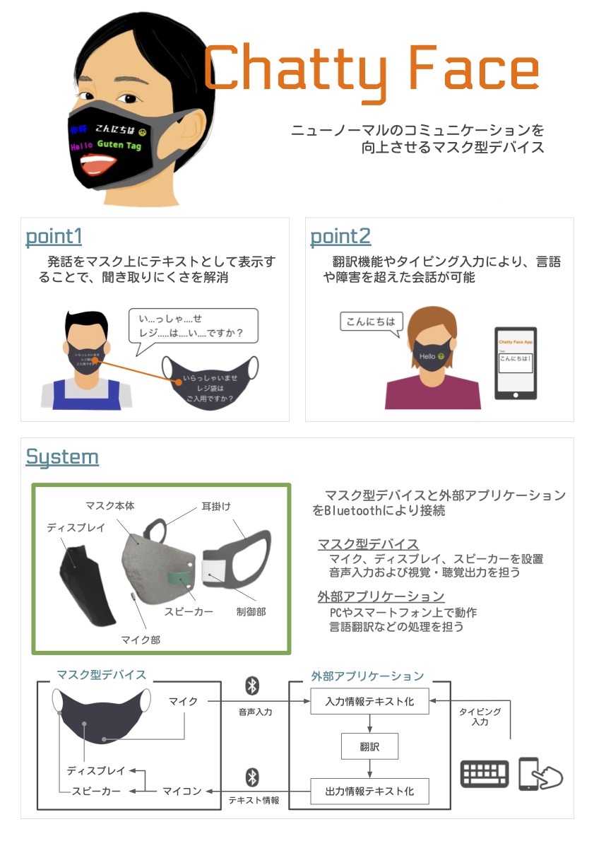 「コミュニケーションを向上させるマスク型デバイス Chatty Face」マスク着用時に発生する問題として、声がこもって聞き取れない、口元が隠れて表情がわからないといったコミュニケーションの問題があります。この問題を解決し、互いの安全を確保しながらも快適に他者との会話を楽しめるようにすることを目指し、マスク型デバイス「Chatty Face」を開発しました。