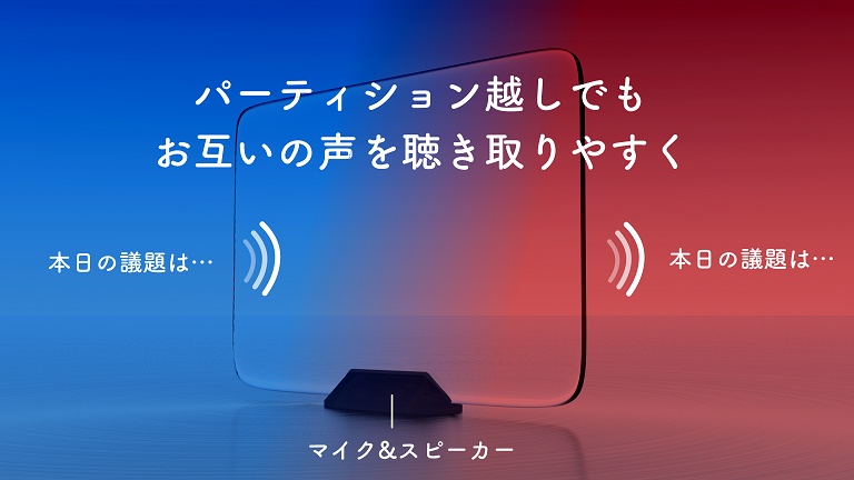 「きこえるパーティション」は、パーティションにマイクとスピーカーを組み込むことにより、感染防止を図りつつ、双方向の快適なコミュニケーションを可能にするプロダクトです。
