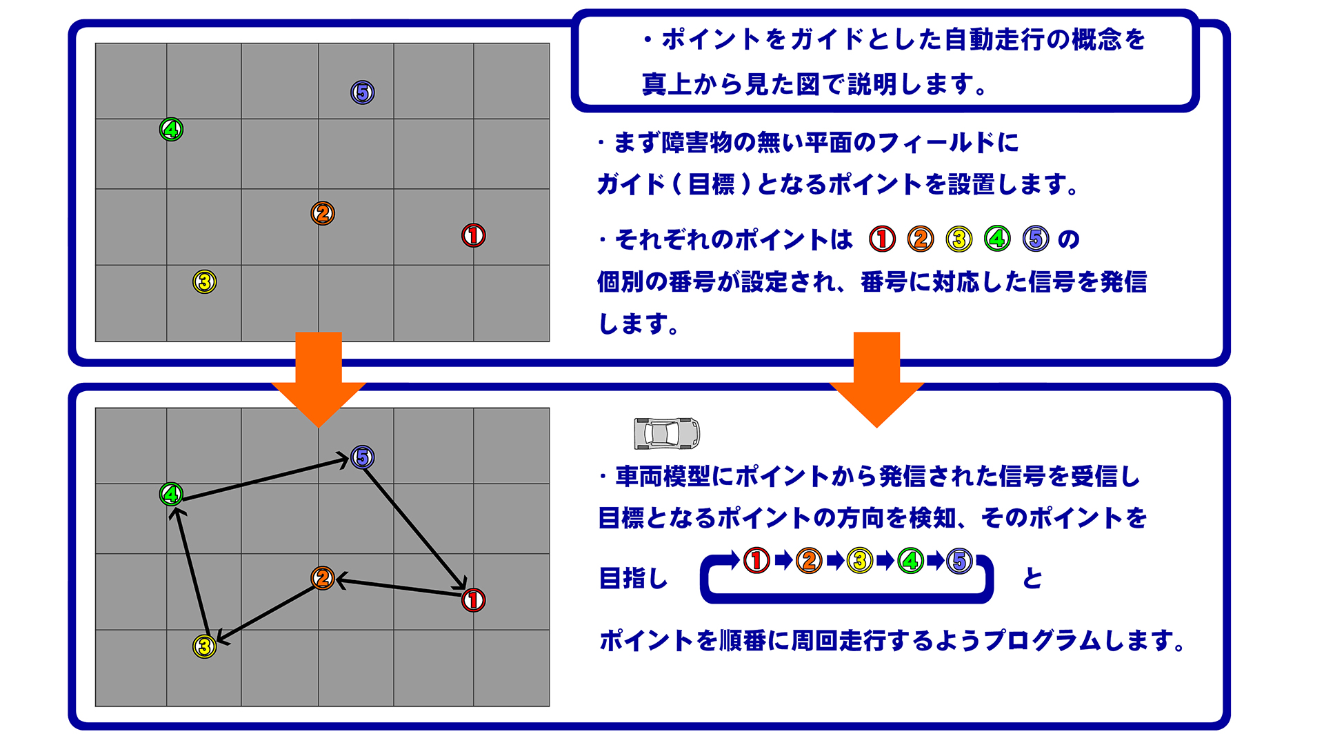 赤外線誘導方式の自動運転システムは、複数の赤外線信号送信機を目標として順にたどり周回走行する自動運転システムです。
