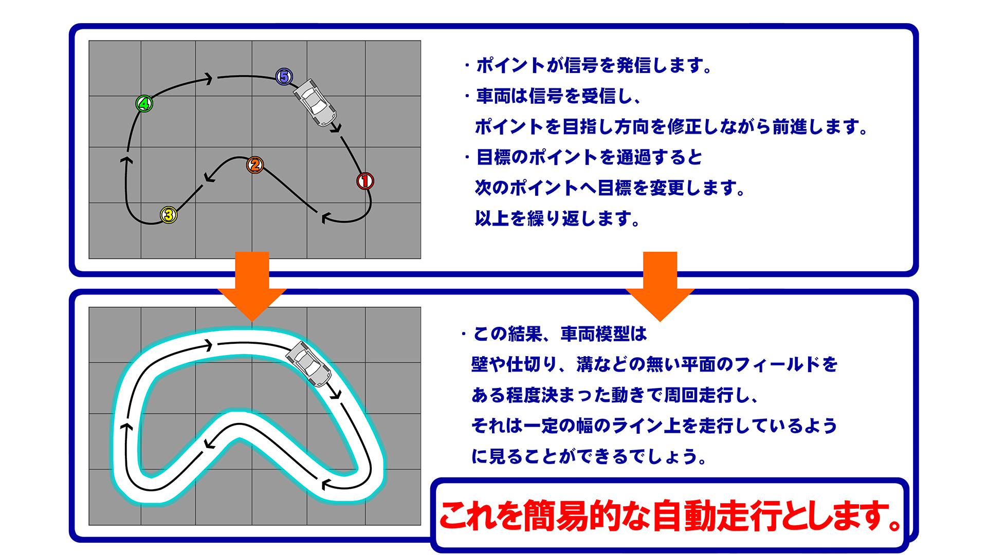 それらの課題を解決するために赤外線誘導方式の自動運転システムをつくりました。