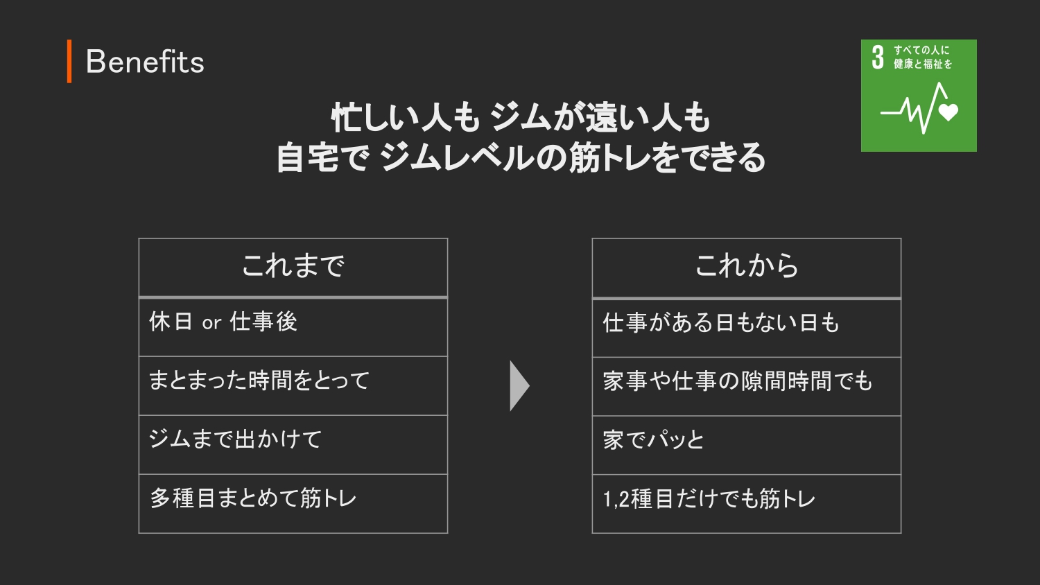 今後も、筋トレをしている方に実際に使ってもらいながら開発を進めます。そして、将来フィットネスとインテリアの融合が当たり前になり、料理や入浴と同様に、自宅で十分な筋トレを済ませることが「ふつう」となって、全ての人が健康と自信を増進できるような未来を実現していきます。