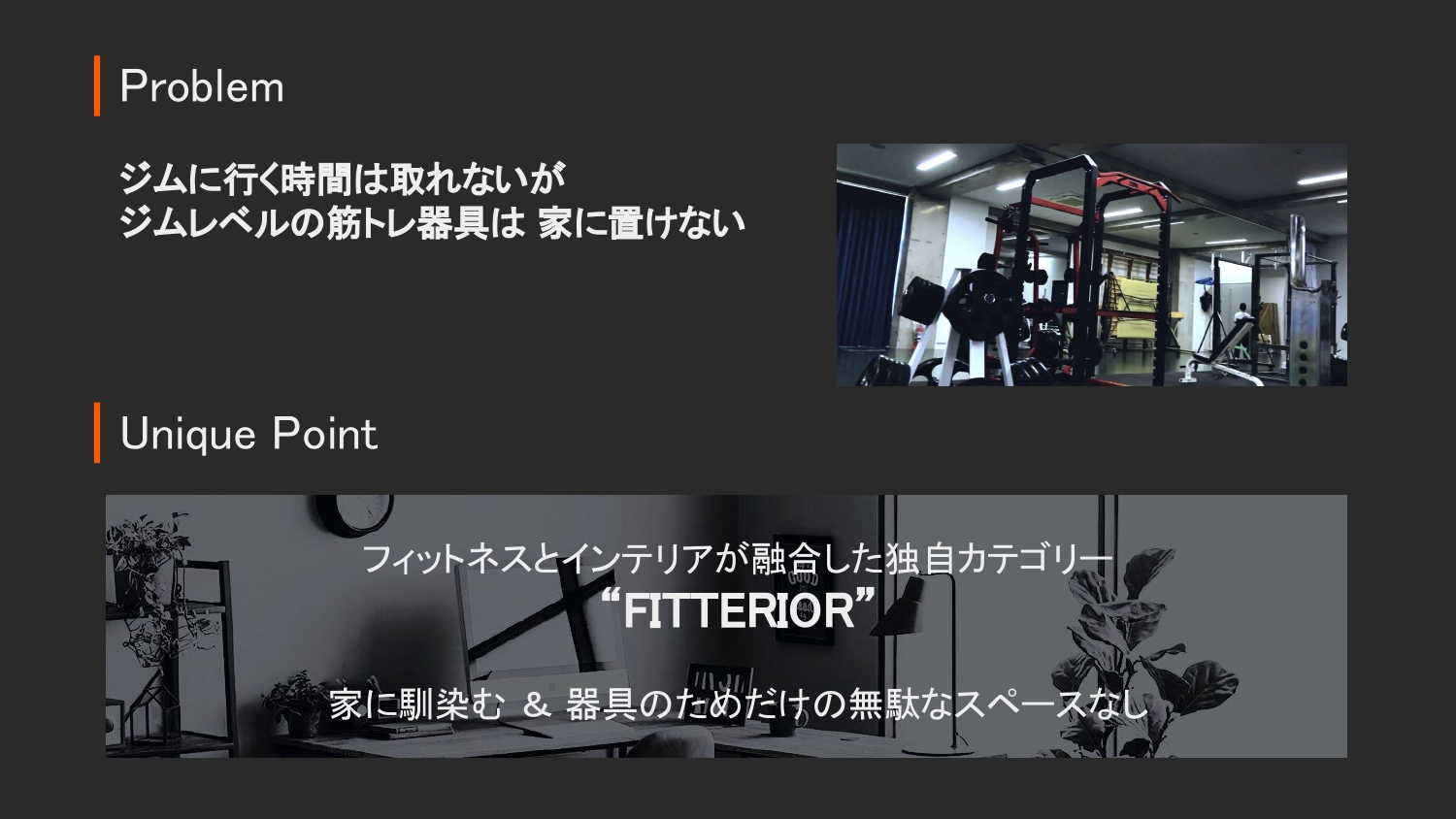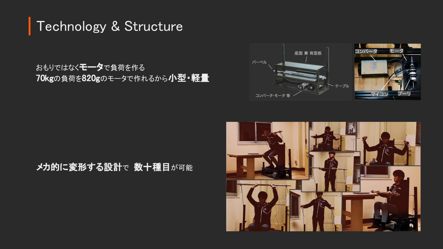 この課題を解決するためにFitteriorを開発しました。Fitteriorには、課題を解決するための3つの特徴があります。1つ目は、普段は椅子として使えることです。家に馴染み、かつ筋トレ器具のためだけの無駄なスペースが不要になります。私たちは、このようにフィットネスとインテリアが融合した独自カテゴリーを"フィッテリア"と名付けています。2つ目は、負荷をモーターにより生じさせる点です。70㎏のおもりと同等の負荷を820gのモーターで作ることができ、小型化・軽量化を実現できます。3つ目は、メカ的に変形する設計で、数十種目が可能なことです。