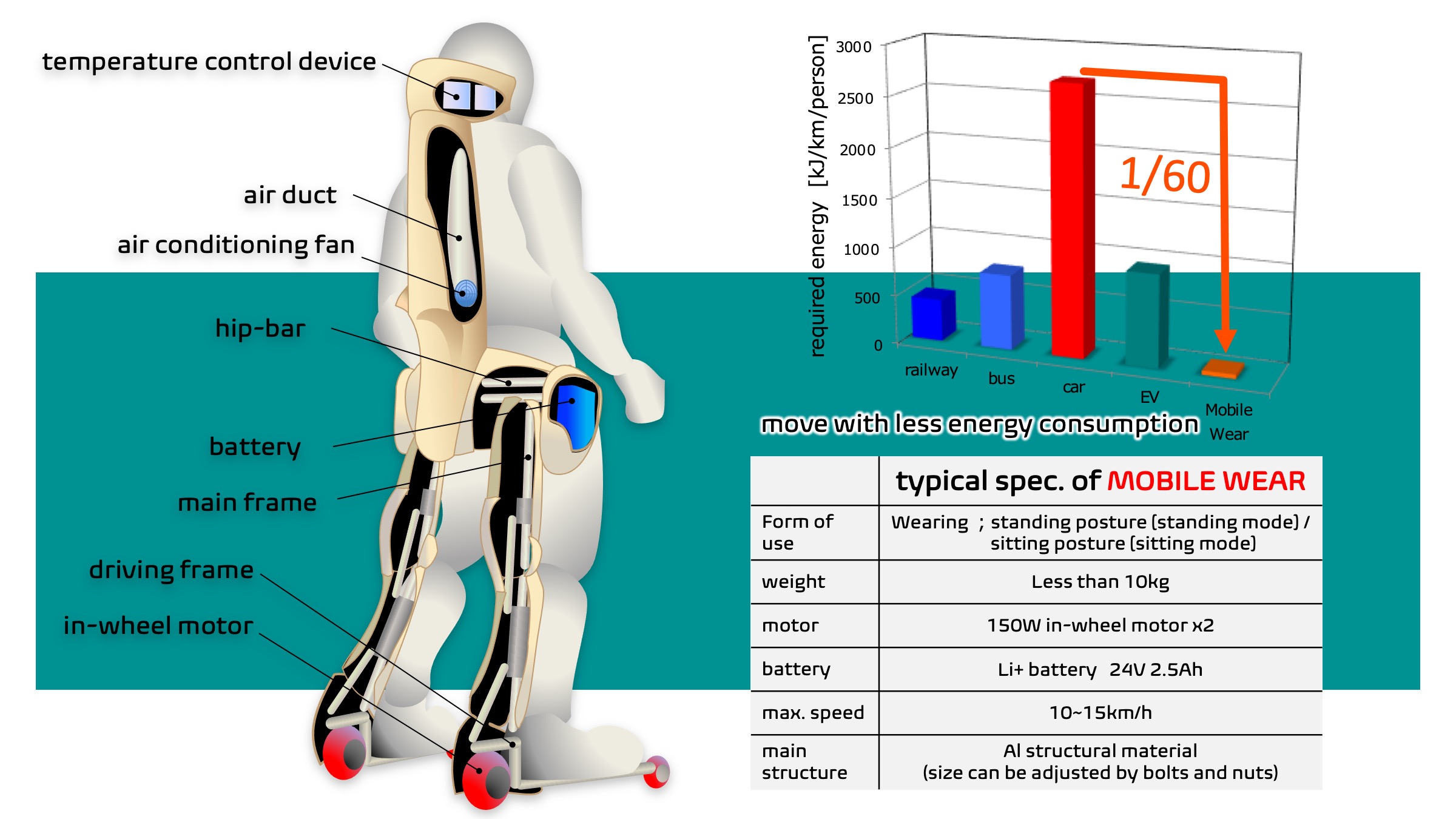 MOBILE WEARが移動に費やすエネルギーはとても小さく(クルマの約1/60)、導入費用も運用コストもクルマに比べればタダ同然です。