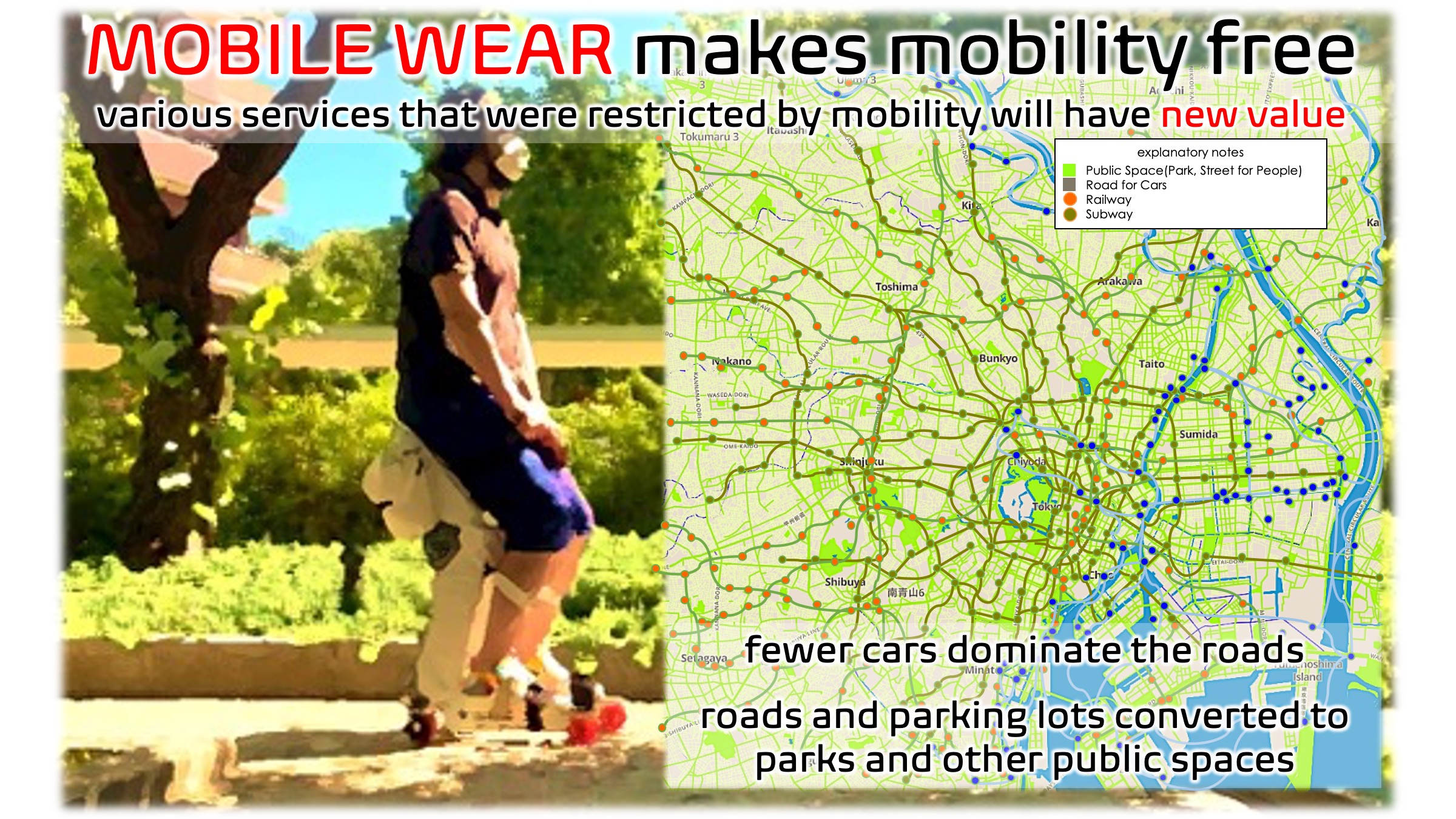 ・クルマに比べてタダ同然、つまり限界費用ほぼゼロで移動できるため、移動に関わる制約を受けていた様々な活動やサービスが新しい価値を持ちます。MOBILE WEARが移動をフリーにすることで道路を支配していたクルマが減少すれば、道路や駐車場は公園などの公共空間へ転換されます