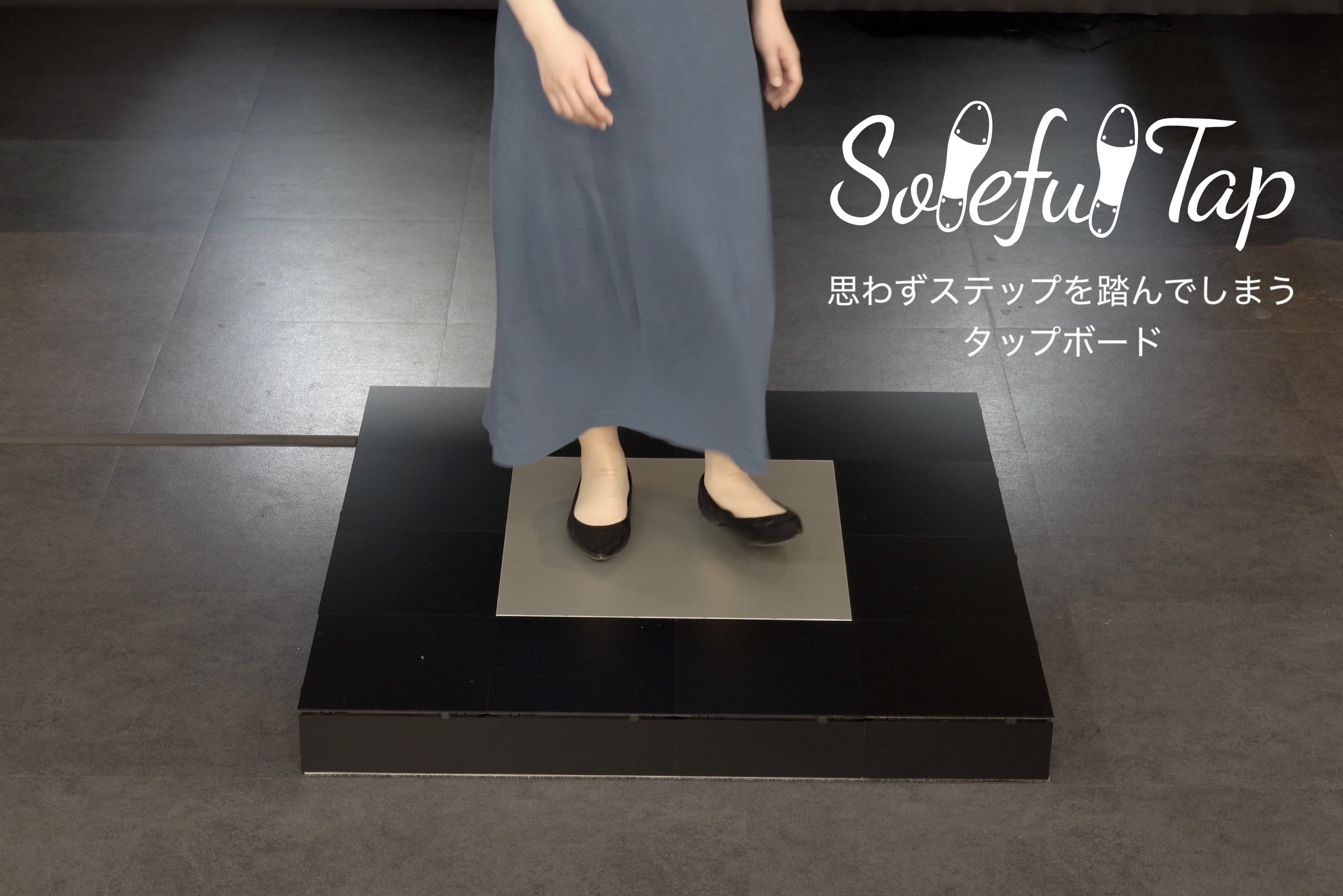 乗った人が思わずステップを踏んでしまう“SolefulTap”というタップボードを制作しました。タップボードの下部にはセンサと複数のソレノイドが配置してあります。ボードに乗った人のステップをセンサで検出し、ソレノイドによる数パターンの打音および足裏へ衝撃を提示します。これによりステップ動作を拡張し、まるでタップダンスを踊っているかのような体験を提供します。