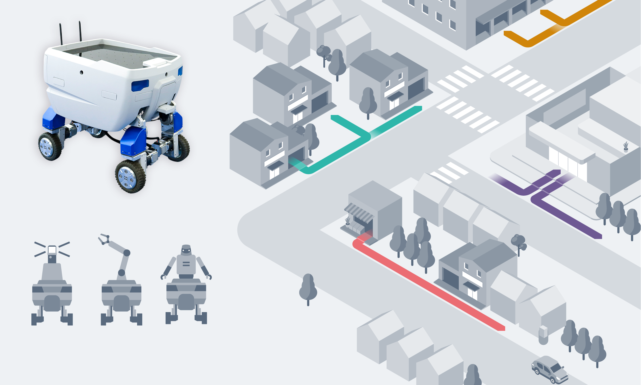 宅配便事業に対しては屋内配送に加え、屋外から屋内のラスト1マイルの配送の自動化による省人化に貢献します。