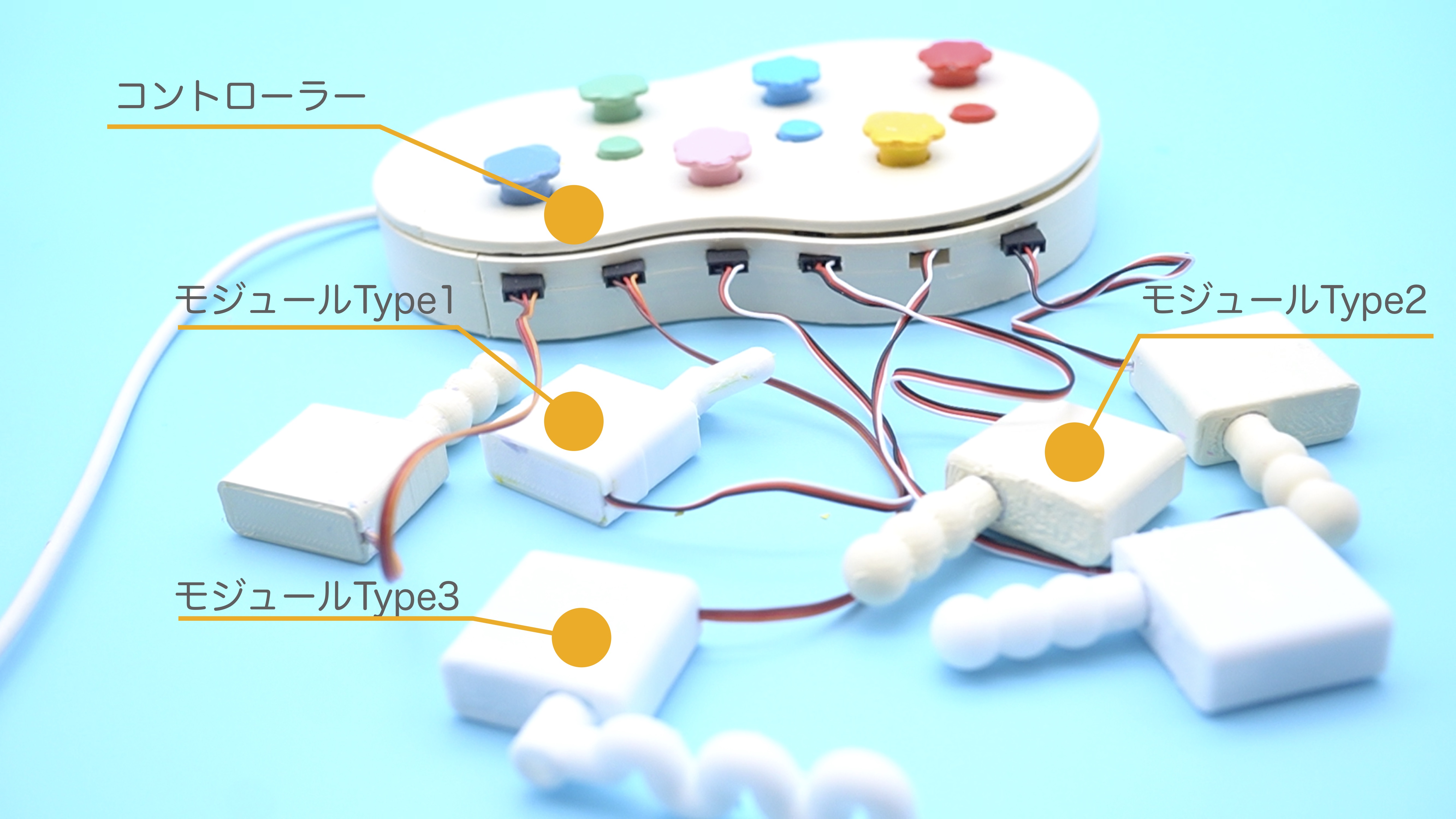 「Squishy bot」は3種類のモジュールと動きを制御するコントローラーからできています。モジュール内にはモーターが内蔵され、コントローラー内は基板とArduino nanoで構成されています。モジュール単体で粘土と組み合わせたり、異なる種類のモジュール同士を組み合わせることもできます。