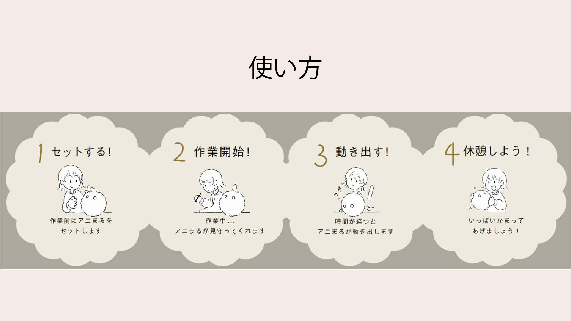 ノンストレスで能動的な切り替えを促してくれるという点です。従来勉強や仕事といった作業では、タイマーを用いて時間を区切ってきました。しかしタイマーのような無機質な機械音は我々のストレスとなってきます。アニまるは、まるでペットに対する愛情から、