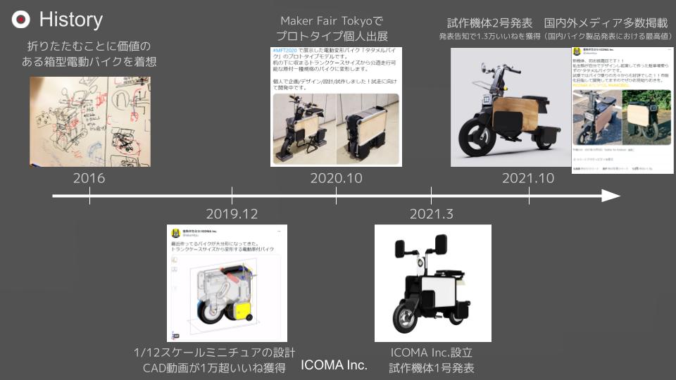 個人活動として、2019年12月頃より、電動折りたたみバイク「タタメルバイク」を制作。2021年、ICOMA Inc.を創業