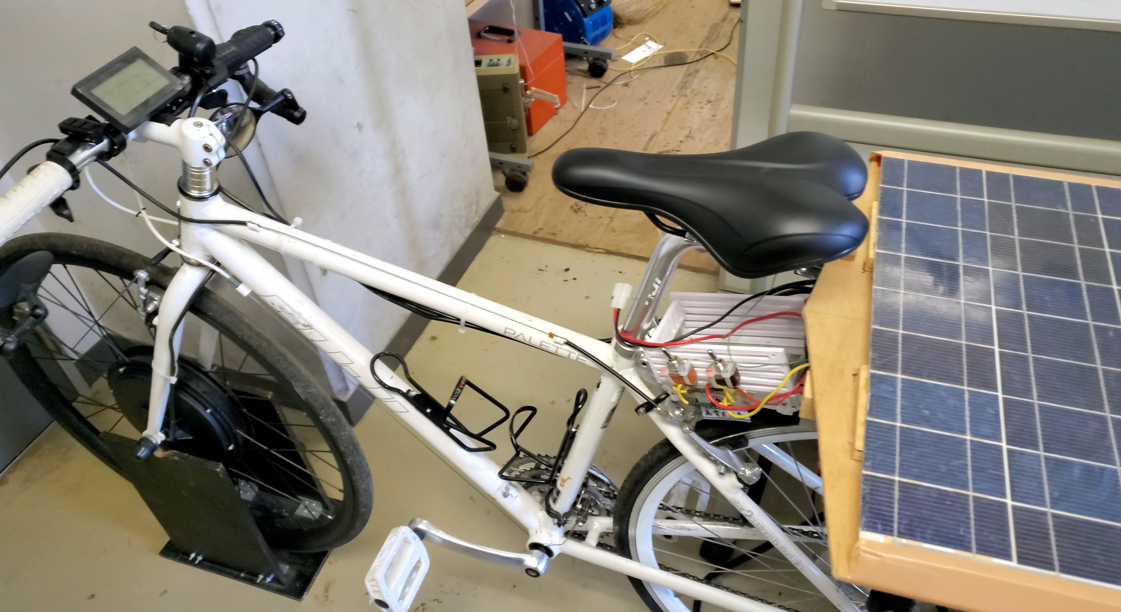 市販のクロスバイクの前輪にブラシレスモータを使ったインホイールモータ(インナーロータ型でダイレクトドライブ)を付け、ハイブリッド電気自動車分野でのPHV(この P はパラレルの P)のように人力による後輪の駆動力と前輪のインホイールモータによる電気自転車であります。リチウムイオンバッテリを搭載しソーラーパネルとリチウムイオンバッテリの両方から電力を得られます。