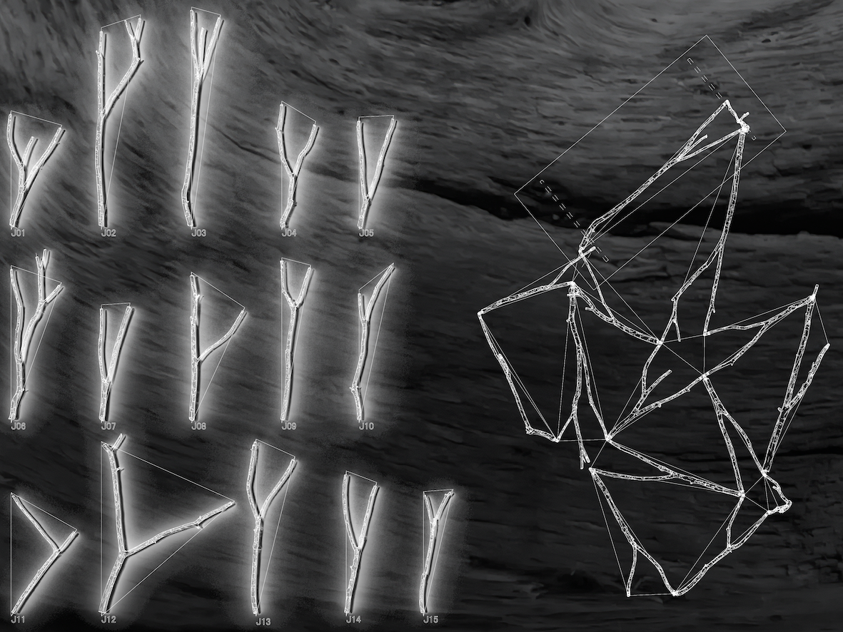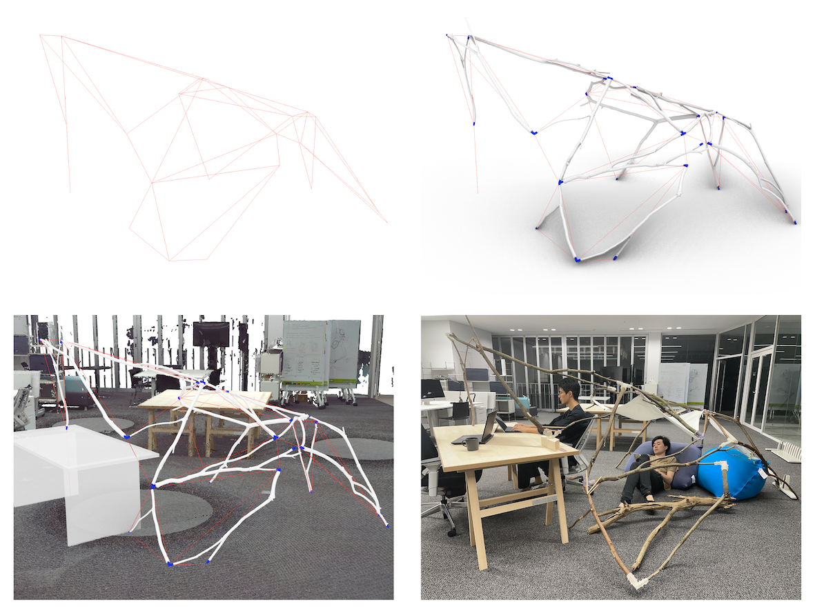 物理演算エンジンによって、任意に選択した枝から実行可能な形状を導出するアルゴリズムを作成しました。マウスを動かしながら形状の調整が可能で、枝の形状に合わせて適したジョイントの形状がモデリングされます。
