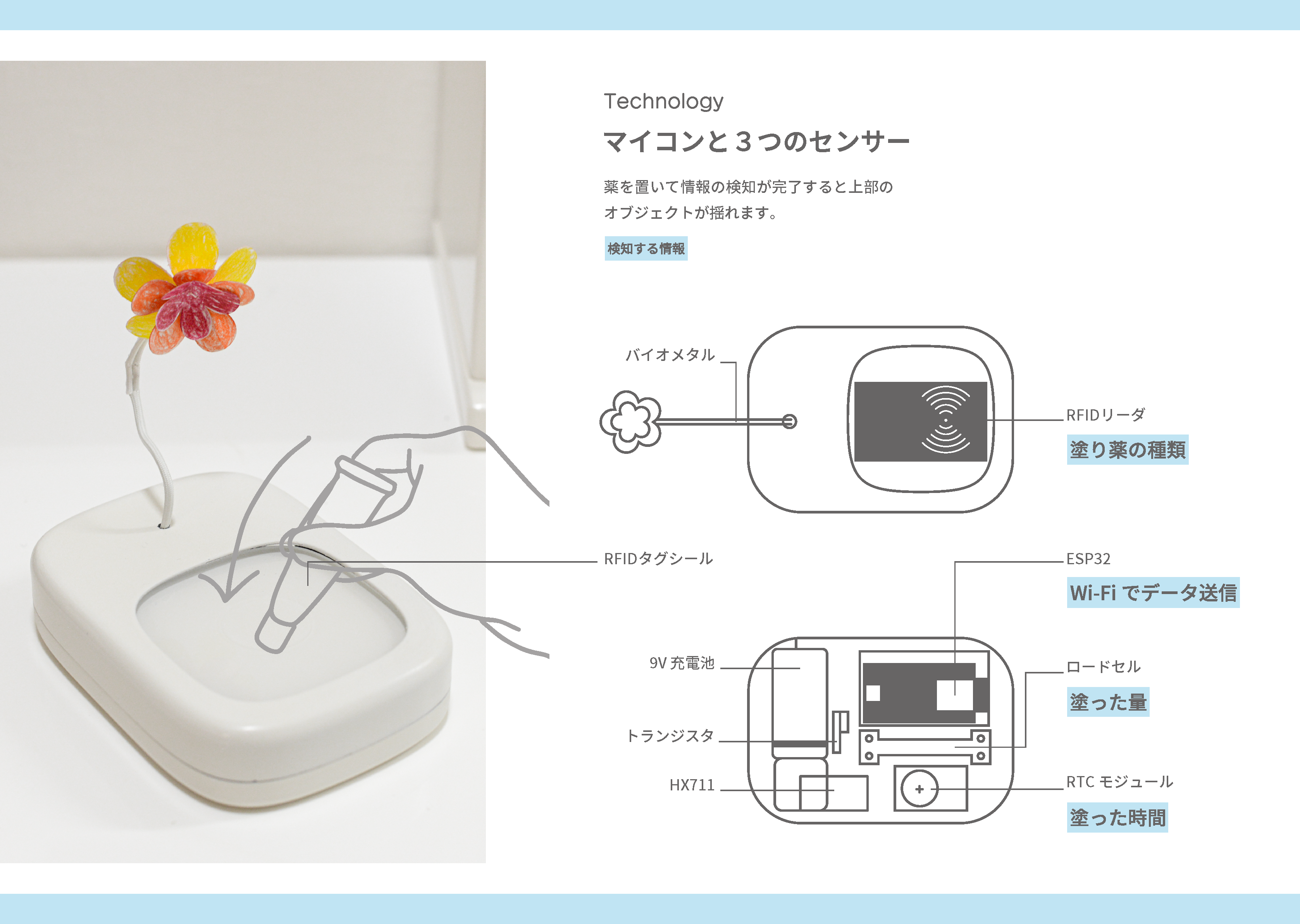 また、薬を置いた時に親子で作ったオブジェクト(花の部分)が揺れることで、子どもが塗る行為を楽しめるように工夫しています。