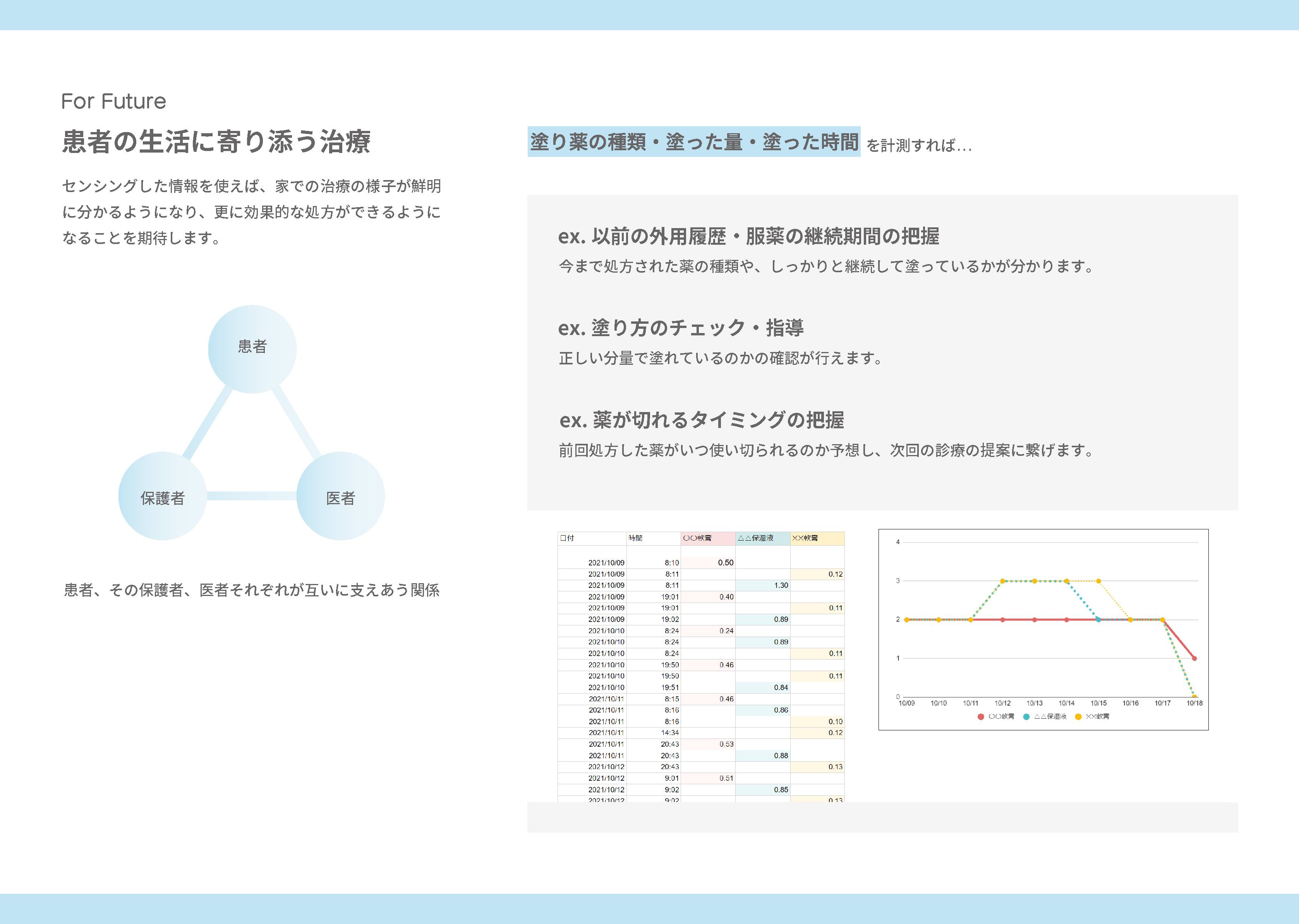 塗った後に記録する手間を省き、子ども自身が塗るように促進することで、皮膚疾患を治療する親御さんの負担を減らします。また、自動記録による情報をお医者さんに提供し、自宅での長期治療のよりよいサポートを目指します。