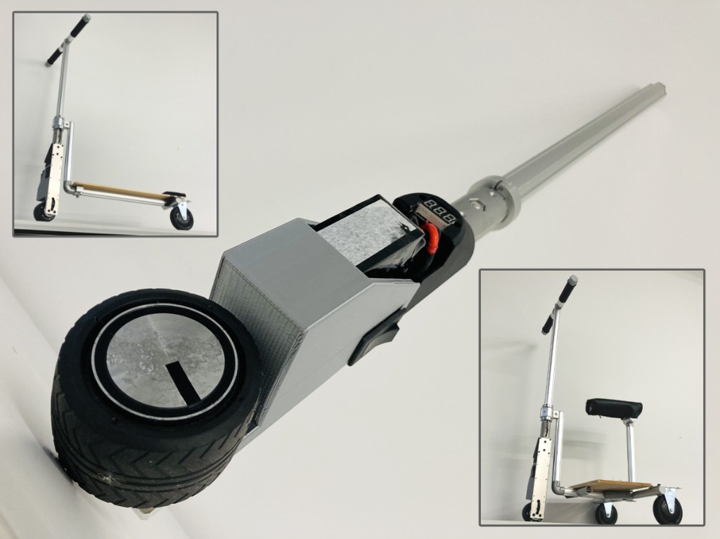 傘のように持ち運ぶことができ、自由に拡張可能なスティックモビリティ。スケボーやインラインスケートなどの「転がるもの」と組み合わせて走行できます。レームを拡張することで、電動キックボードや電動車椅子に進化させることもできます。