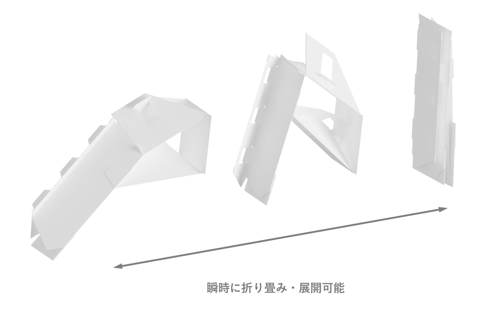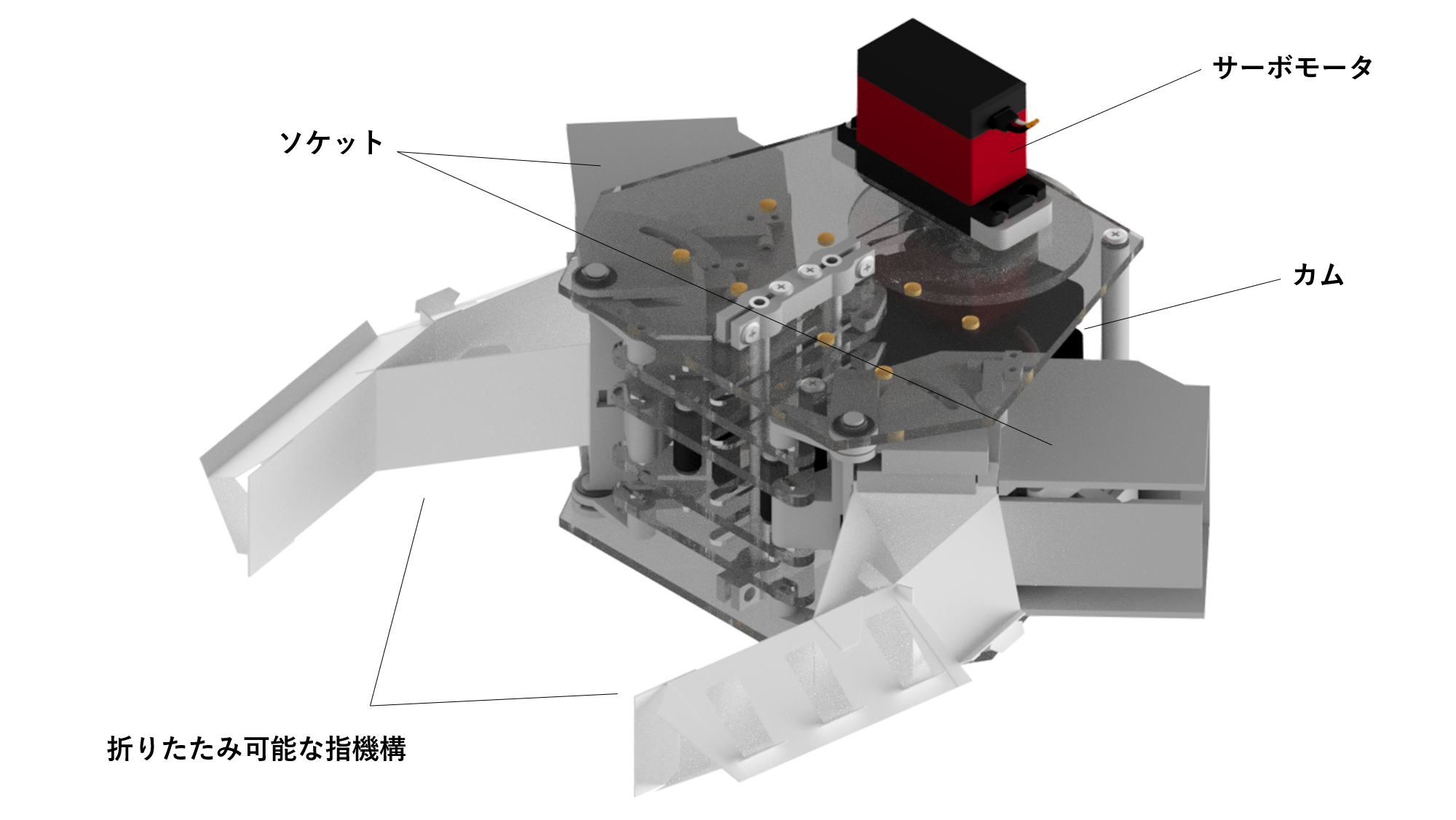 使い捨て利用するとなると、指部分をいくつもストックしておく必要があります。そこで、薄板状態に変形できる機能を付加しました。これにより保管時も場所を取らず、保管中に破損するリスクも軽減できます。また、あらかじめ専用のソケットパーツに折りたたんだ指部分を複数枚収納しておくことで、使い終わった指部分の廃棄と新しいものへの交換を付け替えの手間なしに行うことができます。ソケットを複数用いることで指を瞬時に交換できるロボットハンドを製作可能です。