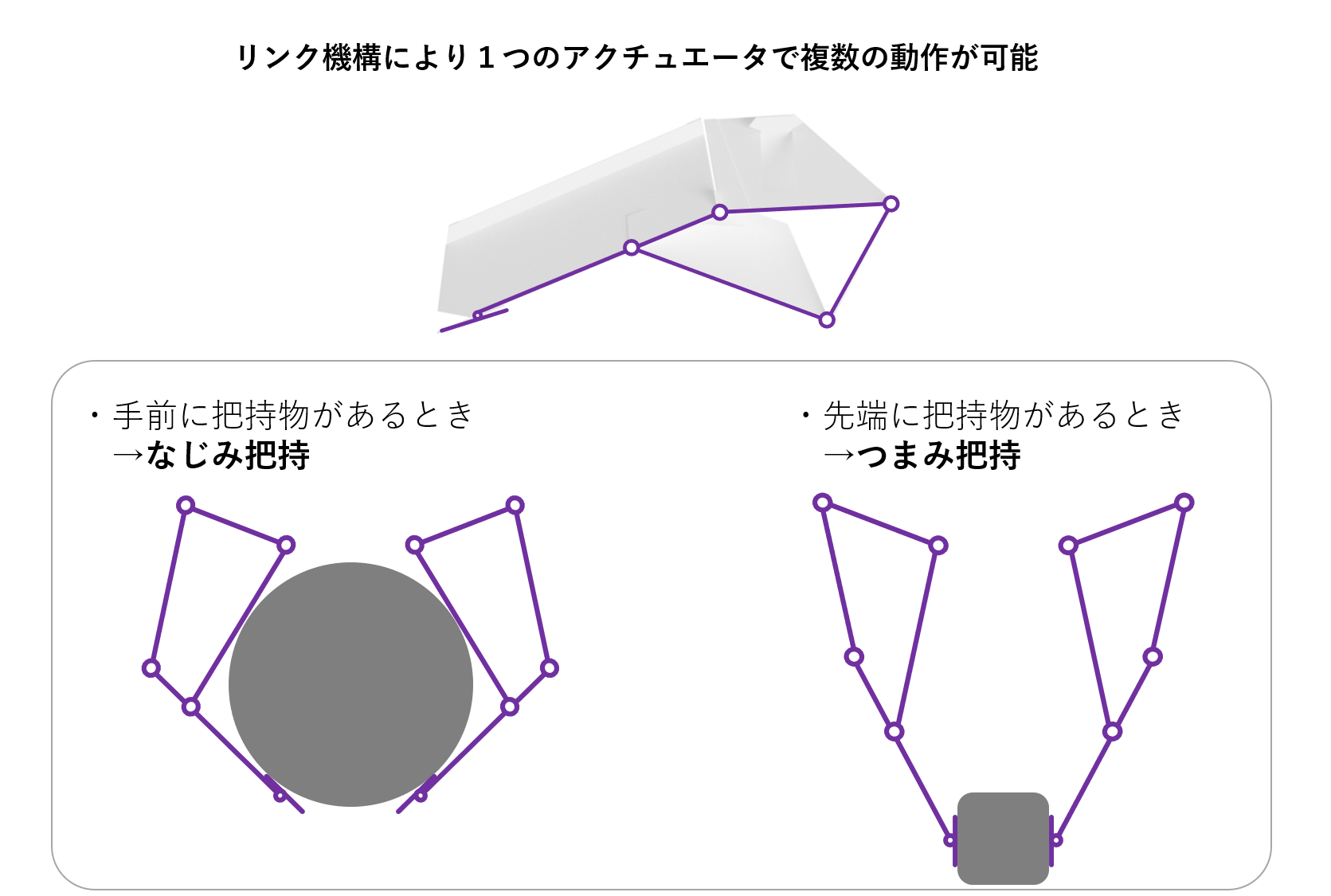 小さなものは指先でつまむ、大きなものは指全体をなじみ込ませてつかむといったように対象物によって把持方法を使い分けることができます。これにより食品など大きさや形にばらつきがあるものにも対応できます。またこれらの動作は受動動作するリンク機構によりモータ1つで実現できるため、複雑な制御が不要でロボットハンドも軽量・低価格化できます。