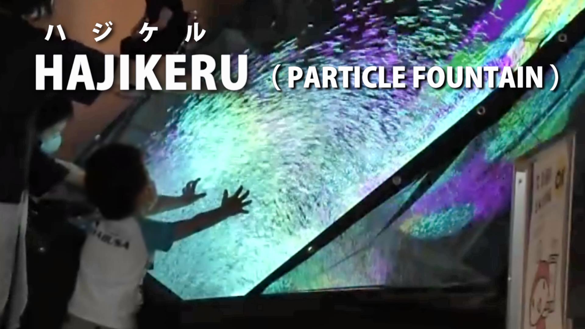 装置の台の上には赤外線光電センサが16個上向きに並んでいます。体験者が腕を突き出す動作をすると、センサが腕を検出し、腕の位置の送風機を動作させて発泡ビーズを噴き上げ、同時にプロジェクターからカラフルな映像の投影を行います。体験者の多くから「まるで自分の手から光るビームを発射しているようだ」との感想が得られました。