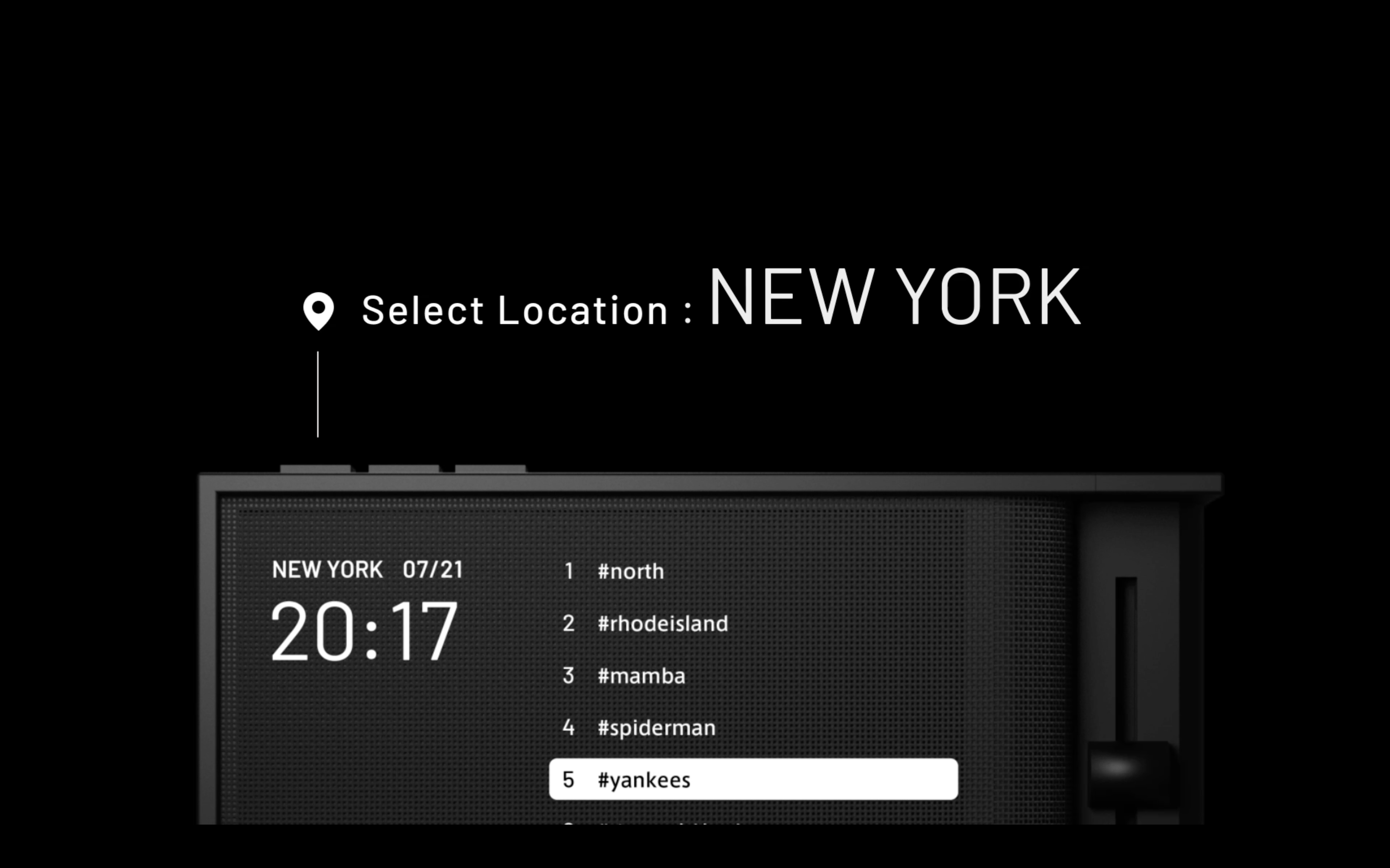 NewYork/London/Tokyoの中からエリアを選択し、お好みのハッシュタグにチューナーを合わせればその時、その場所の空気をあらわした音楽を楽しむことができる。