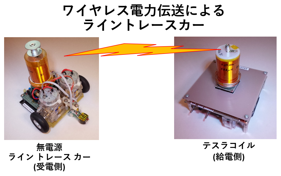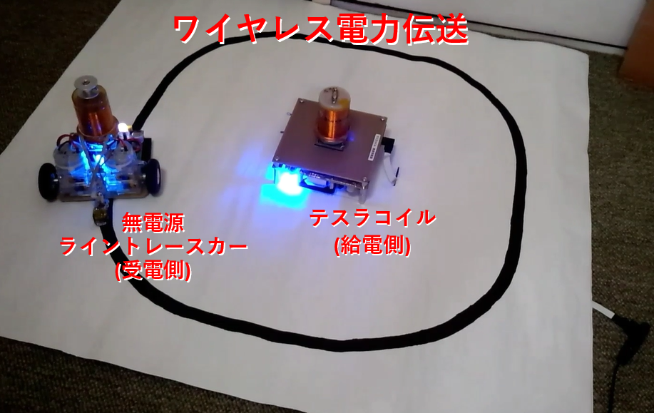 ライントレースカーは共振コイルを搭載しており、この共振現象を利用して、テスラコイル発振機からライントレースカーへ無線で電気エネルギーを伝送します。