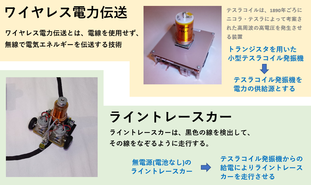 ライントレースカーは黒色の線などをセンサーで検出して、線をなぞるように走行しますが、ここで紹介する作品は、無電源(電池なし)のライントレースカーがワイヤレス電力伝送によって走行します。ワイヤレス電力伝送は、電線を使わずに無線で電気エネルギーを送る技術です。