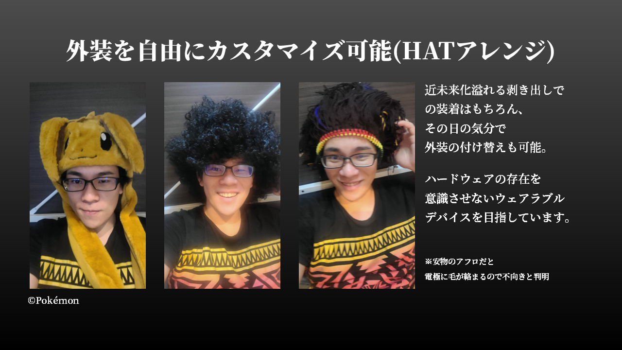 本デバイスはそれらを打破すべく「被るだけでシェアしたくなる」デバイスという概念を打ち破るファッションとしての(外側の)デザインと、