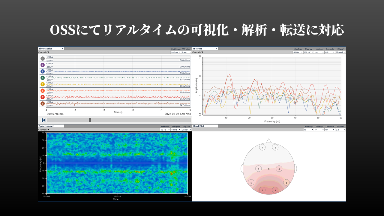 このデバイスはリアルタイムでの可視化はもちろん、OSCやUDPなどのネットワークプロトコル転送に対応しており、記録した脳波データの保存・再生も可能です。