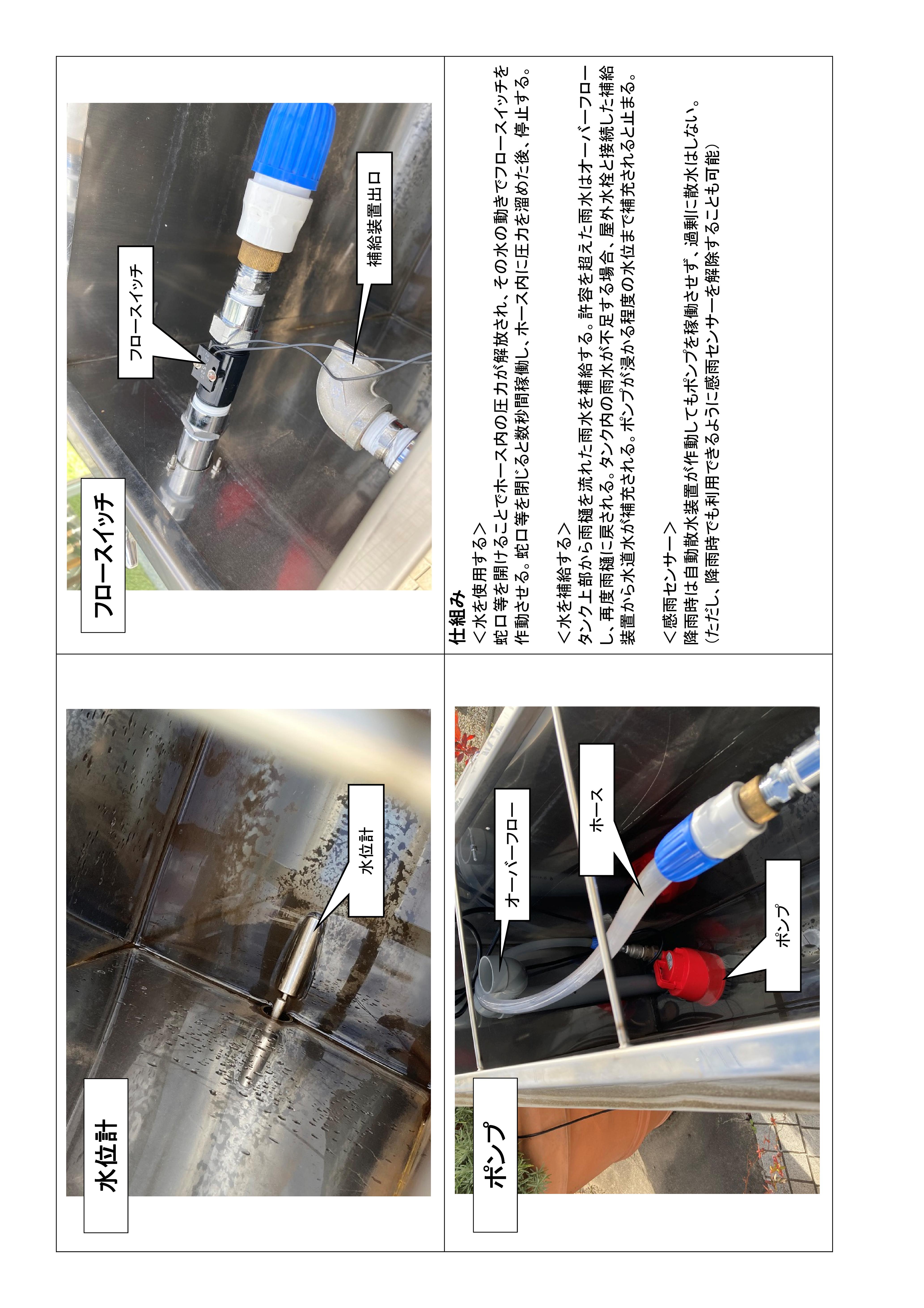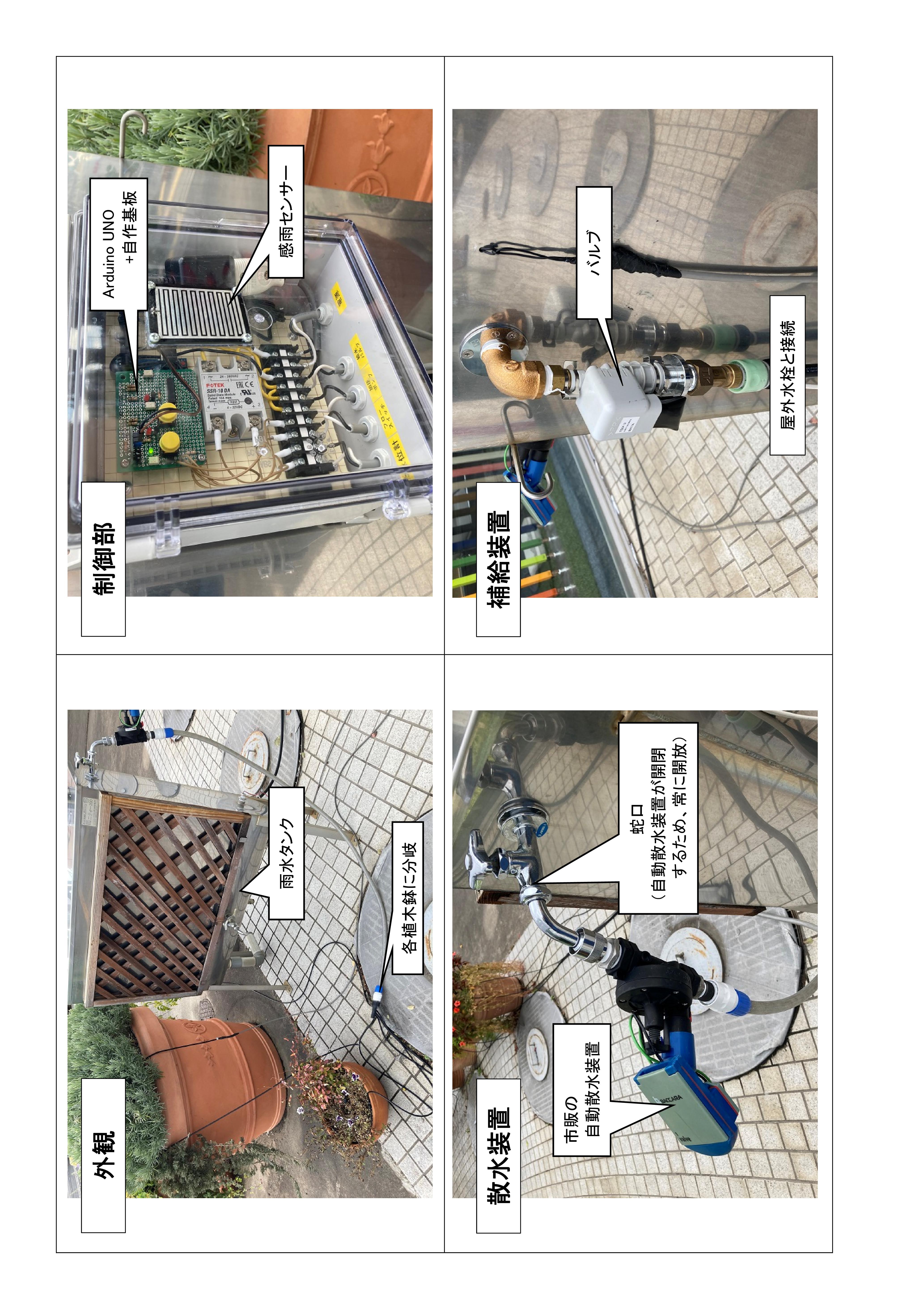 今回の作品は、雨水タンクの蛇口を開けると同時にポンプが自動で作動します。さらにタンク内の雨水が不足すれば、水道水を自動で補給し、いつでも利用することができます。