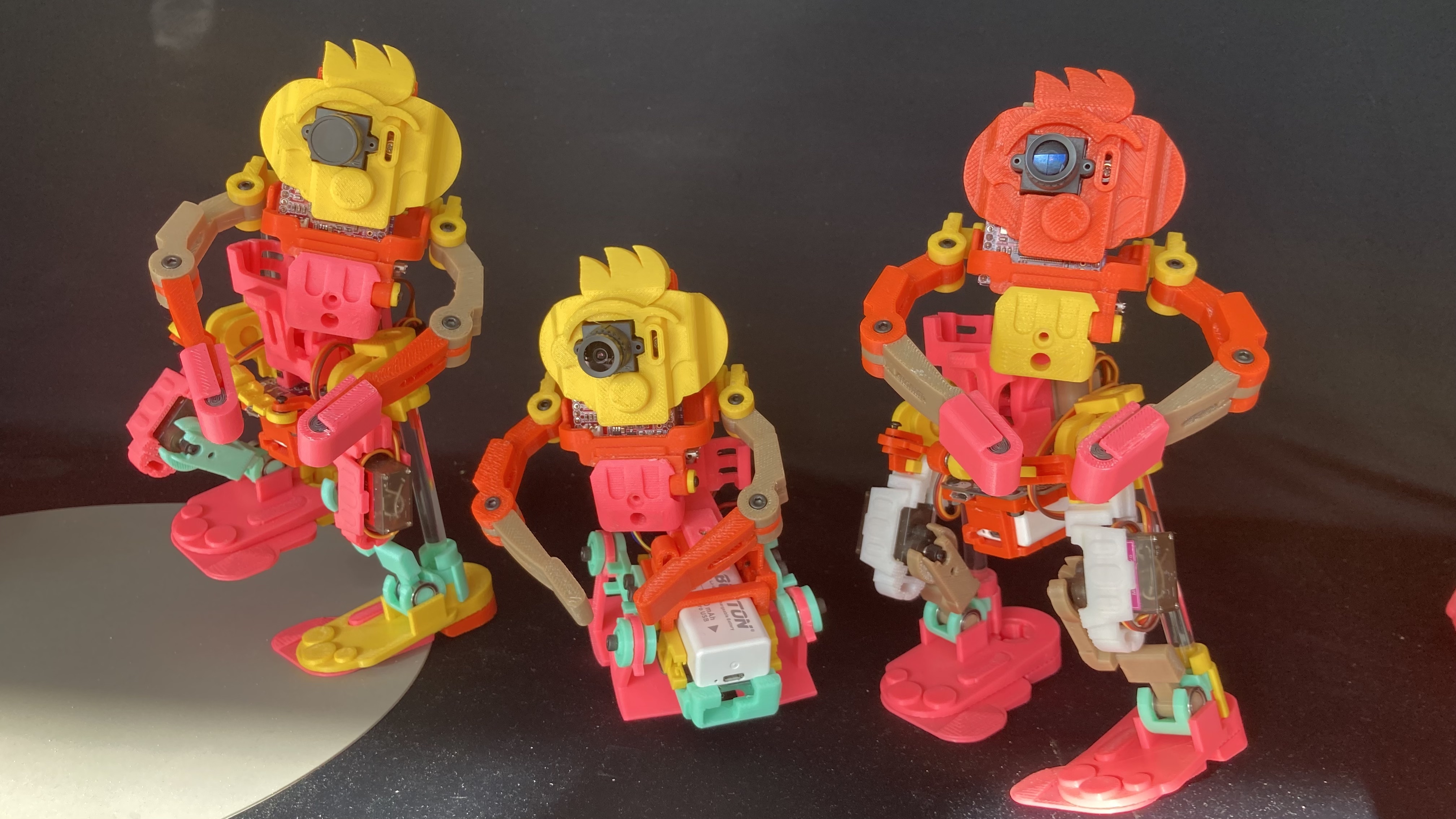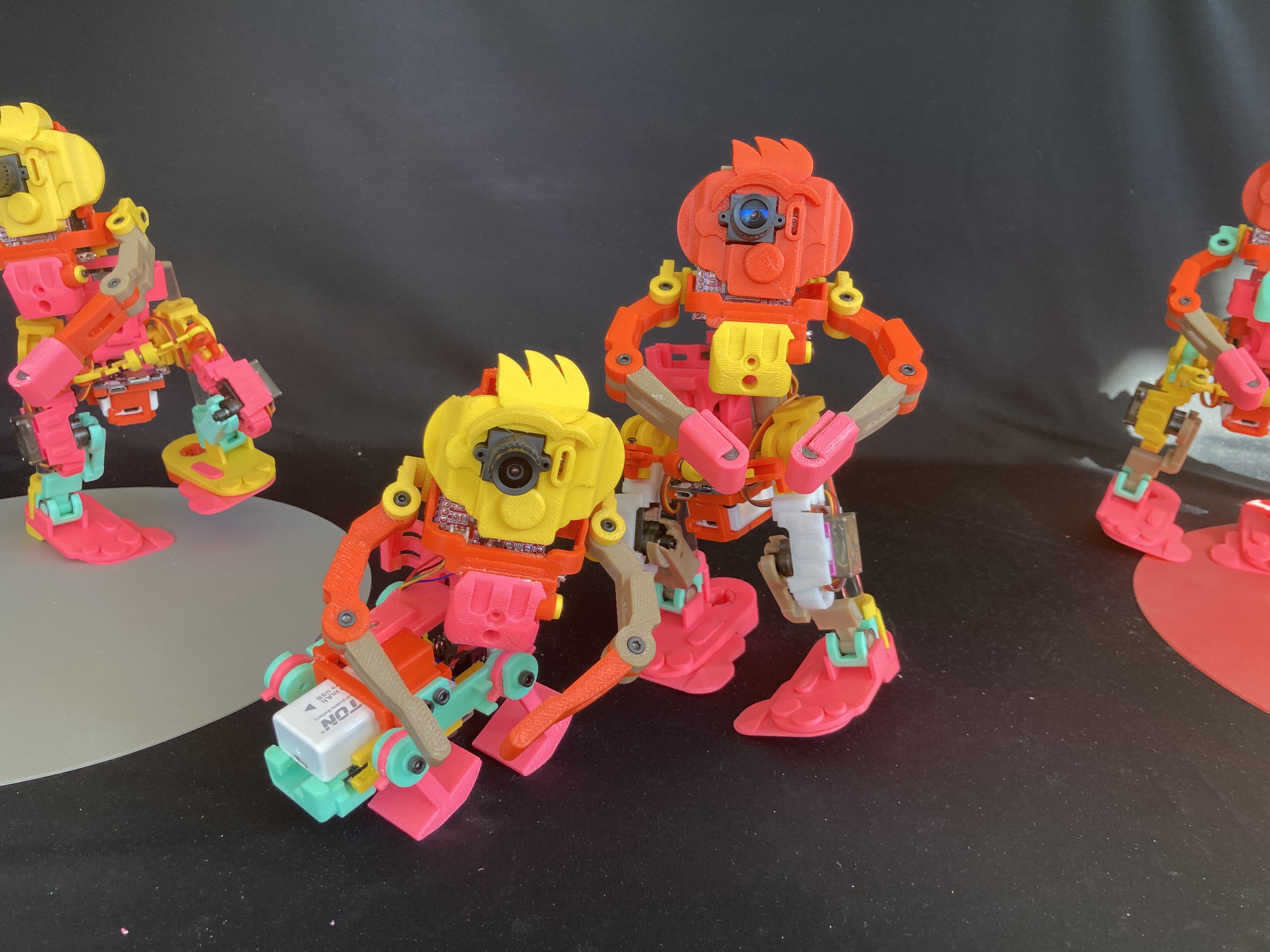 ロボットの動力(サーボモータなど)が多いと価格や重量が増え扱いにくくなるので、それらを出来るだけ削減しました。 2足ロボットは首と足の合計3個、4足ロボットには1個のみを使用しています。 バッテリーも小さくなりAI制御を伴うカメラなどを配置する余裕ができました。
