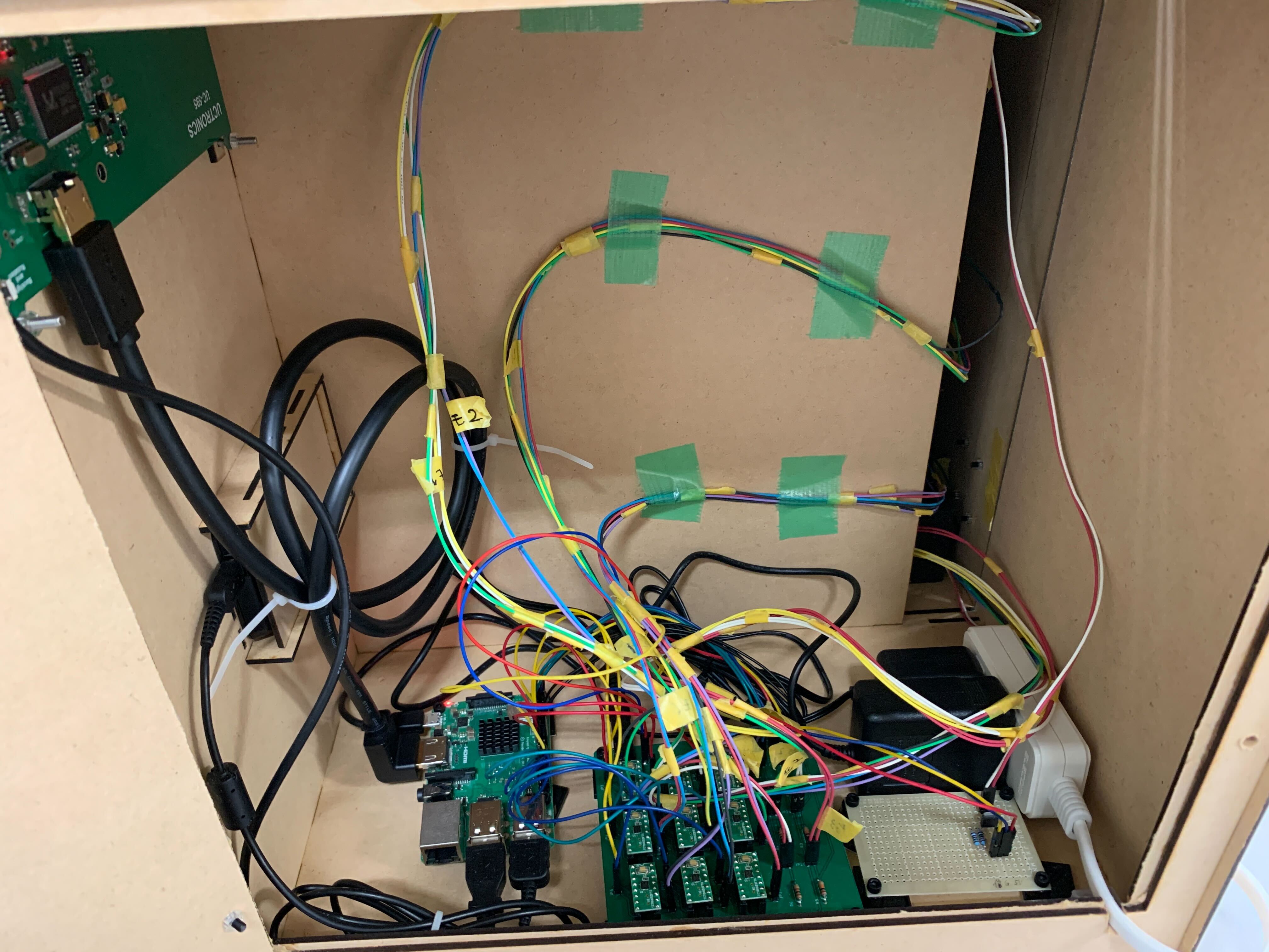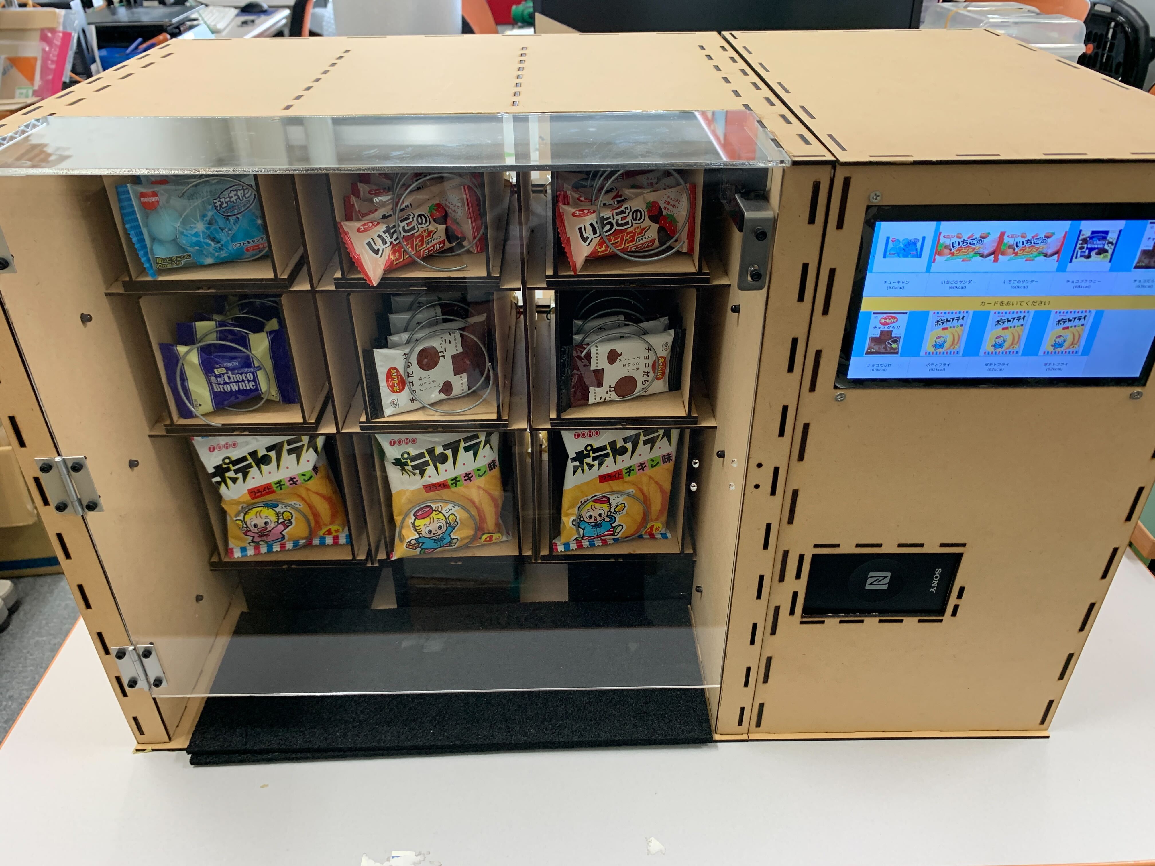 本機はNFCカードの読み取り、タッチパネル、商品排出、Webサーバーといった制御をRaspberry Piで行っています。メンテナンス性にも優れており、タッチパネル等が含まれる制御部の横とポートがある排出部の背面は開閉できる扉がついているので、機器内部に異常があった場合、容易に確認することができます。