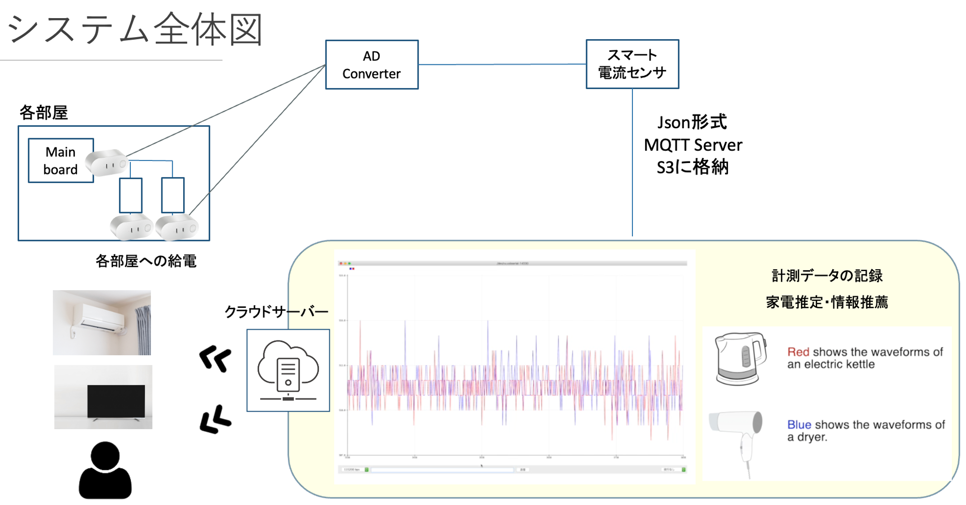我々が一般的に使用している家電は、使用される電力量や電圧、必要時間が異なるため、電気の流れを具に分析することで、どの家電が、いつ、どの程度使用されているのか推定することが可能です。そして、現代人は置きている間、ほとんど何かしらの電力を利用しているため、自宅に大量の人感センサーや開閉センサーを配置せずとも、なるべくプライバシーを侵害しない形でユーザーの生活様式を把握できると考えました。
