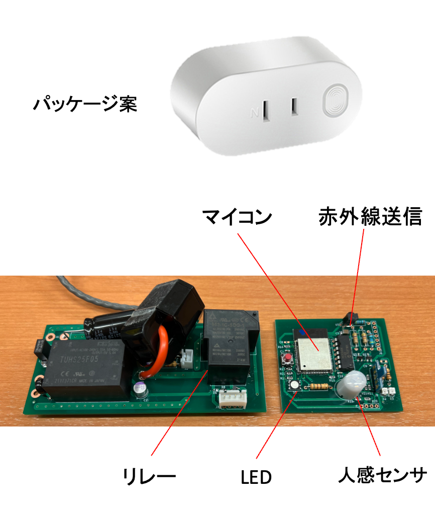 ホームアシスト・スマートプラグ内には、電流センサーのみでなく、赤外線送信機とリレースイッチ、人感センサ、温湿度センサが搭載されているため、状況に合わせて特定の家電(エアコン、テレビなど)を調整したり、赤外線に対応していない家電でもリレーでオンオフするといったインタラクションを可能にします。