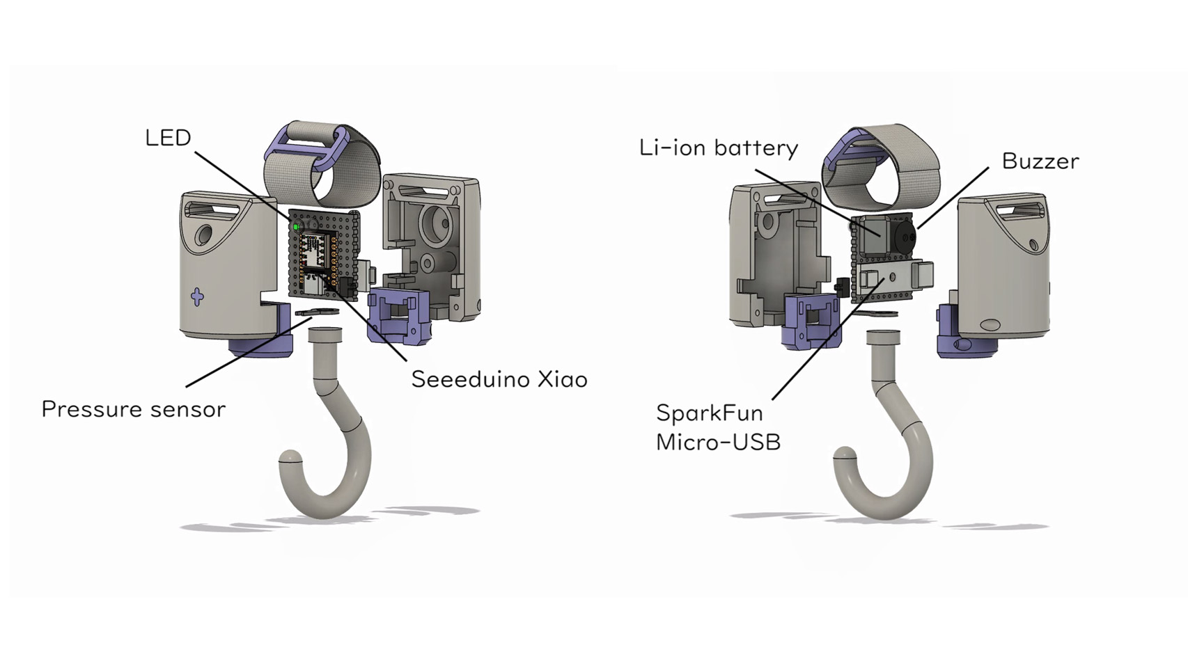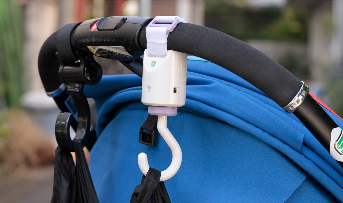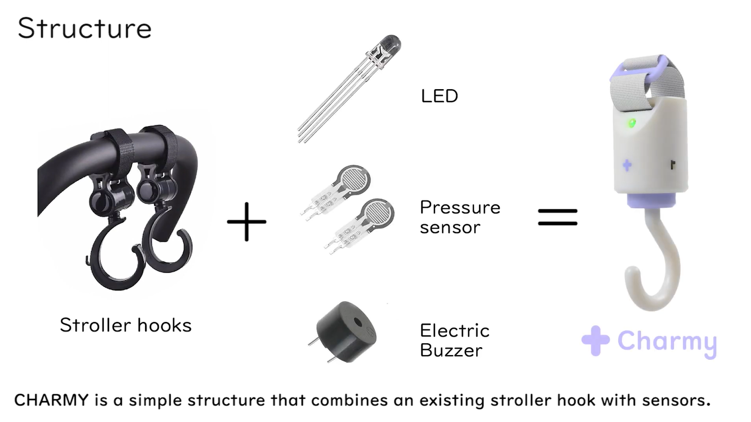 私たちは、ベビーカーの転倒を防ぐ安全装置を開発しました。仕組みとしては、Charmyに荷物を吊り下げると同時に、感圧センサーが荷重を検知します。感圧センサーにかかる荷重が1.2kg(転倒しやすい危険な荷重)に差し掛かると、LEDと小型ブザーが作動する仕組みです。これによって、使用者は事前に危険な荷重を認識し、ハンドルの荷物を減らす等の対策をとることができます。