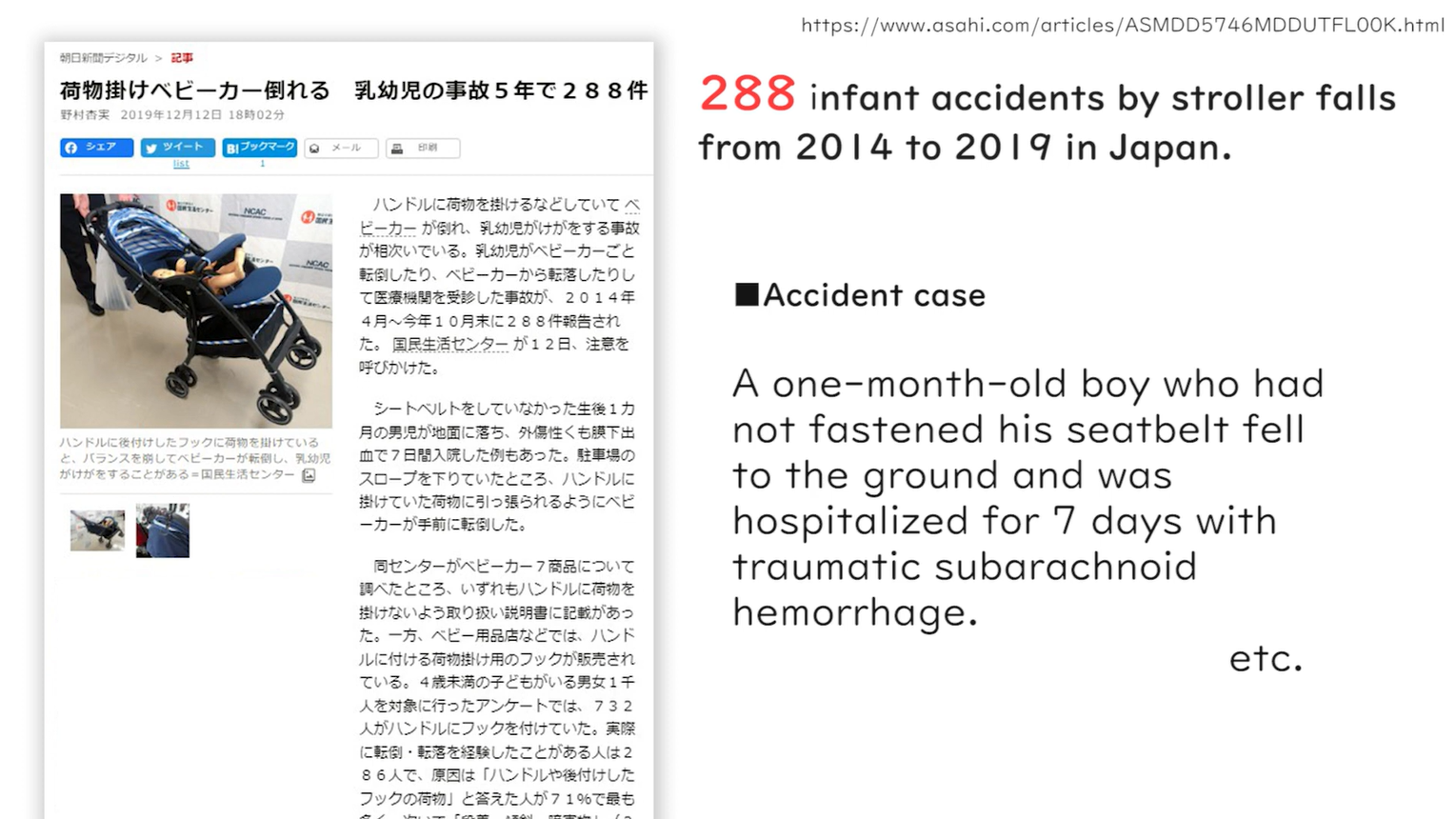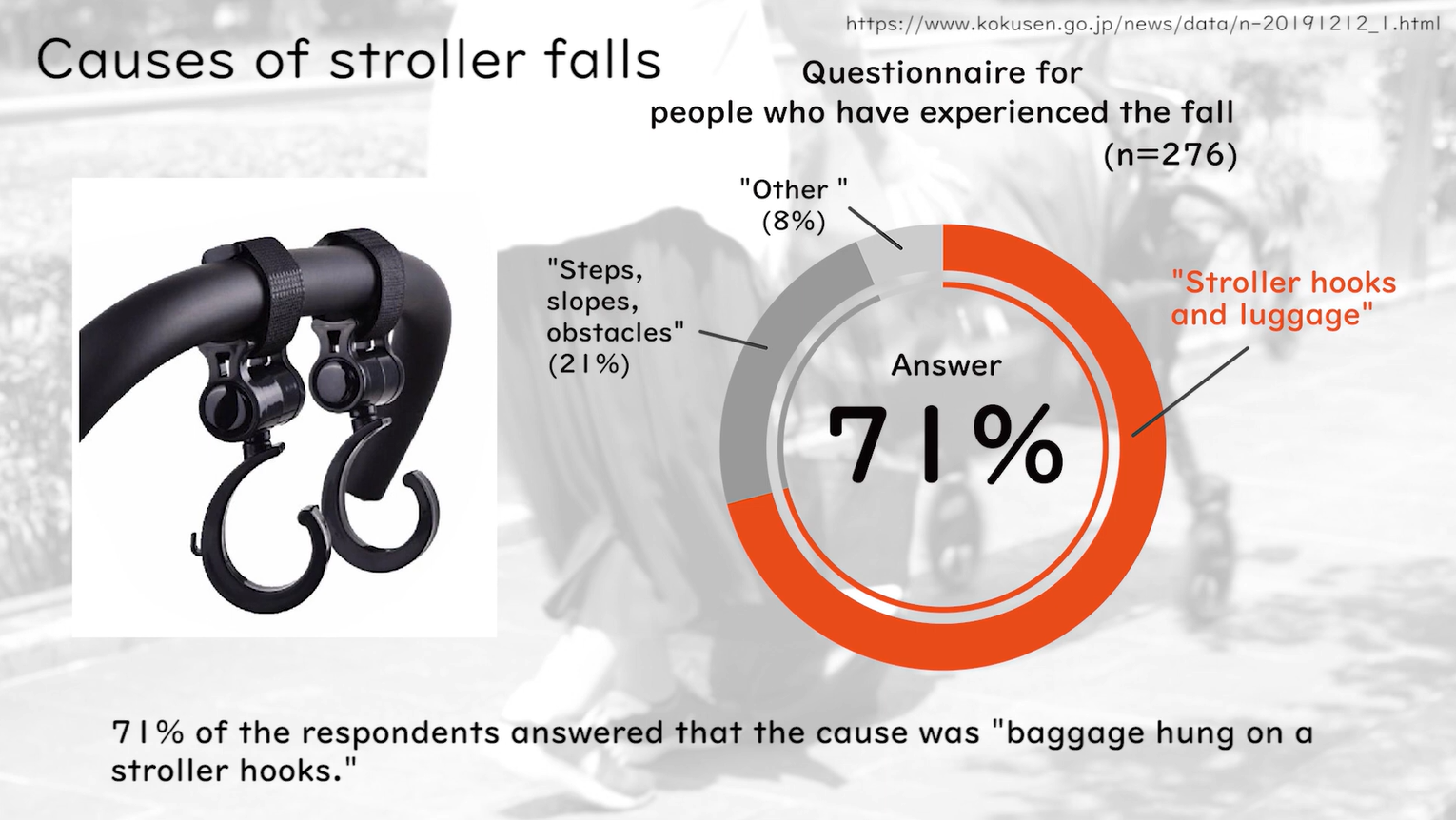 近年、ベビーカー使用中の転倒により幼児が大怪我を負う事故が増加しています。独立行政法人国民生活センターの調査によると、2014年~2019年の間にベビーカーごと転倒あるいは乳幼児が転落して怪我をした事例が288件寄せられています。中には、転倒によって地面に転落し、外傷性くも膜下出血を引き起こす大怪我に繋がったケースもあります。また、同センターが実施した、転倒を経験した使用者に向けたアンケート調査によると、原因は「荷提げフックの荷物」と回答した人は全体の71%を占めました。しかし、荷提げフックは荷物の出し入れがしやすく利便性が高いため、危険性を認識していてもベビーカーに後付けしてしまう人が多い状況です。