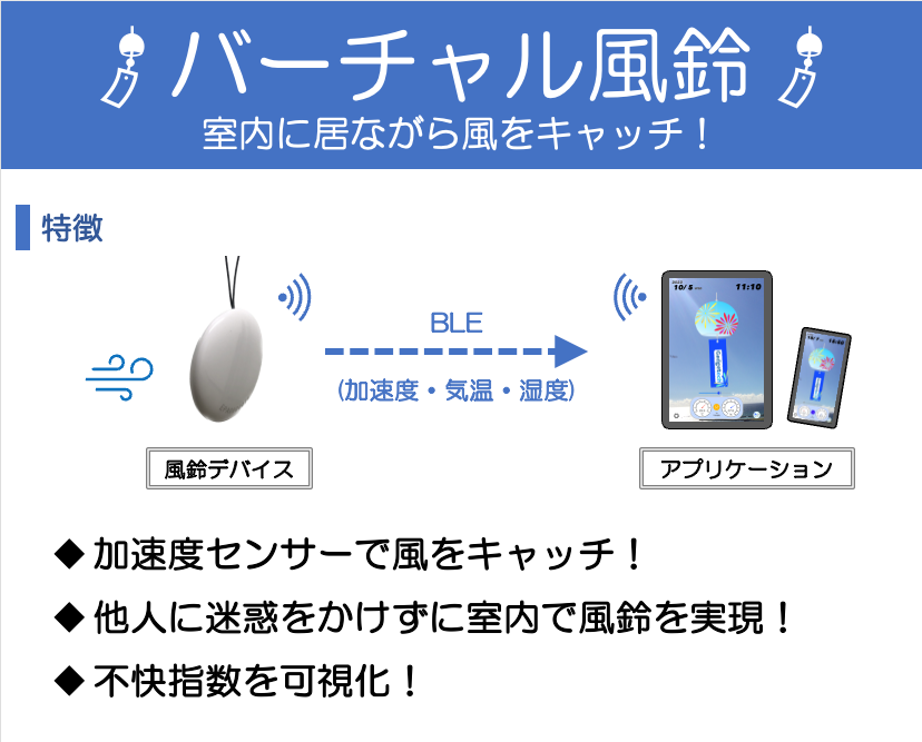 そこで、騒音がなく、屋内で自分たちだけで楽しむデバイスと風鈴アプリを開発しました。