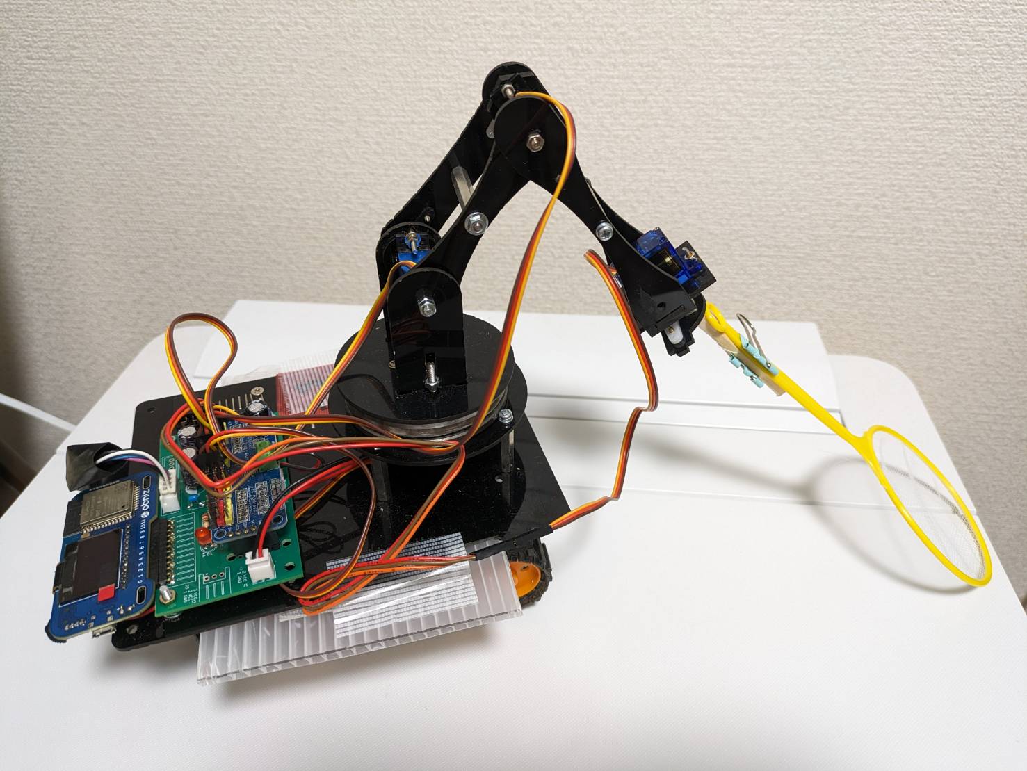 今回 金魚がアームロボットの可動範囲から離れた位置に退避するため アームロボットにタイヤをつけて対応した。