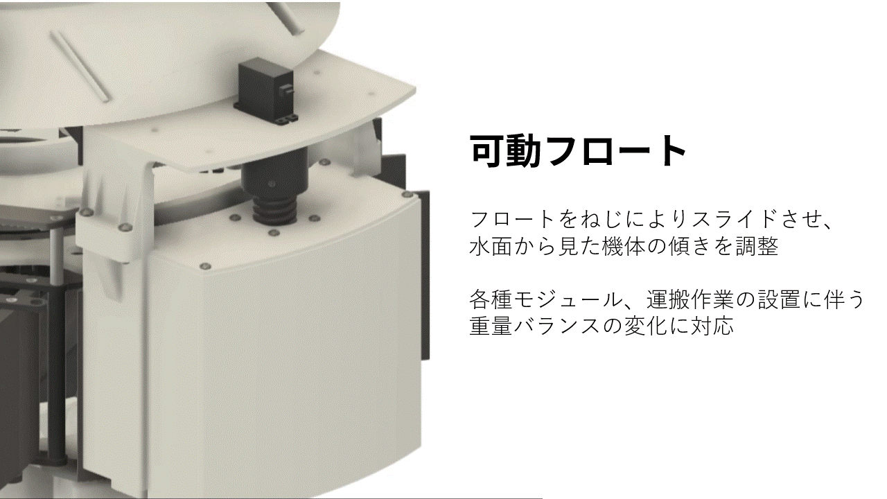 機体の周囲3点に取り付けられたフロートは、ねじによる送りで上下方向に動く事ができ、これによって機体の傾きなどを三脚の要領で調整することができます。ドローンに搭載するモジュールによるバランスのズレを補正することが可能です。