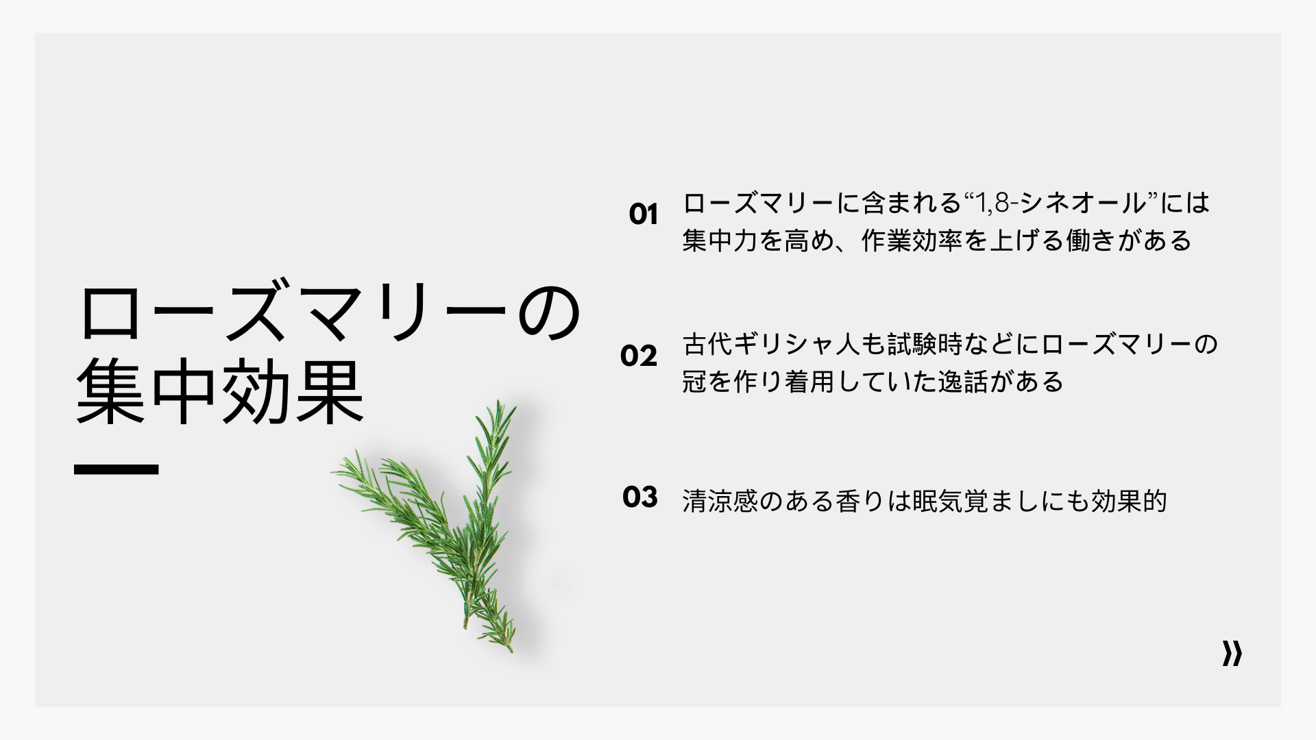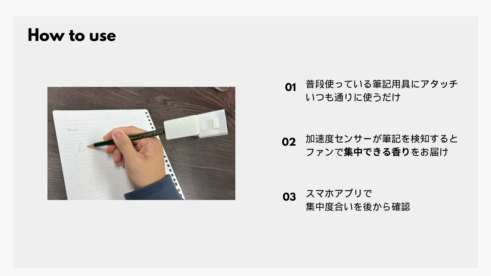 ローズマリーの香りは集中できる香りとして太古から知られていて、学習しているときにこのデバイスを装着したペンを使うことで、集中力を高めることができます。