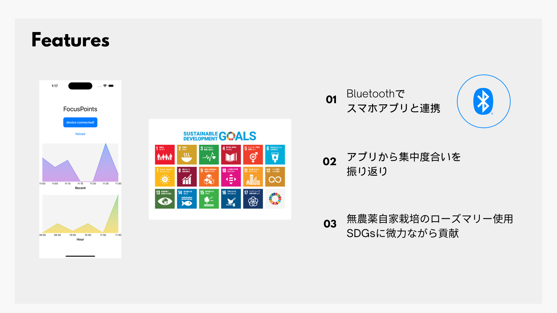 ・スマホアプリとBLEで接続して、集中度を後から振り返り