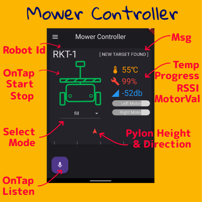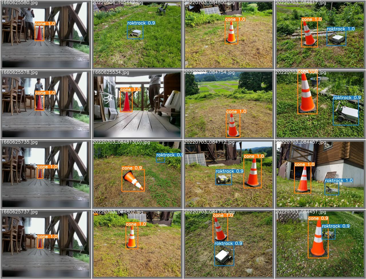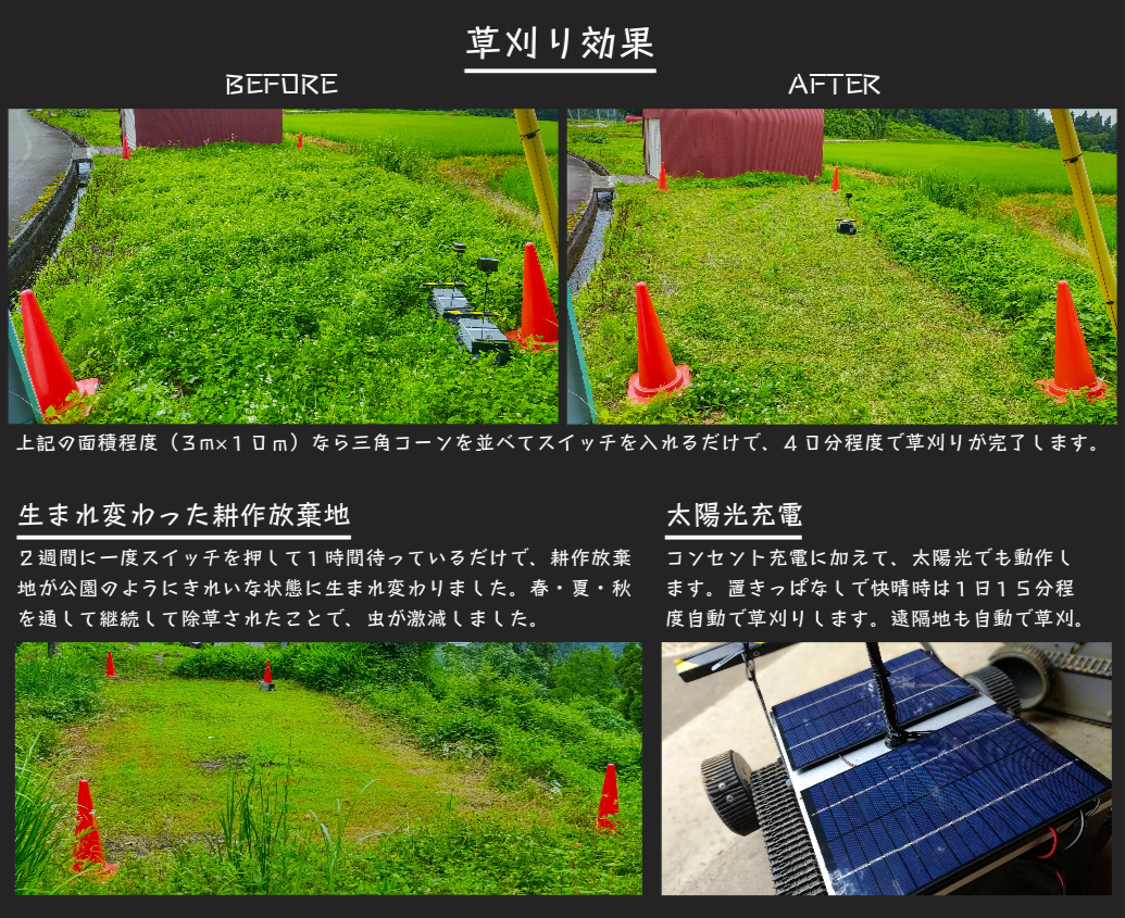 草を刈りたい範囲にパイロン(三角コーン)を並べて電源スイッチを入れるだけで、範囲内の草を刈る。物体検出技術を使いパイロンを認識し、その方向に向かう。認識した高さから距離を推定し、一定以上近づいたら旋回して次のパイロンを見つける。徐々に旋回タイミングを早くすることで内側に入り込み、面の刈り取りを行う。