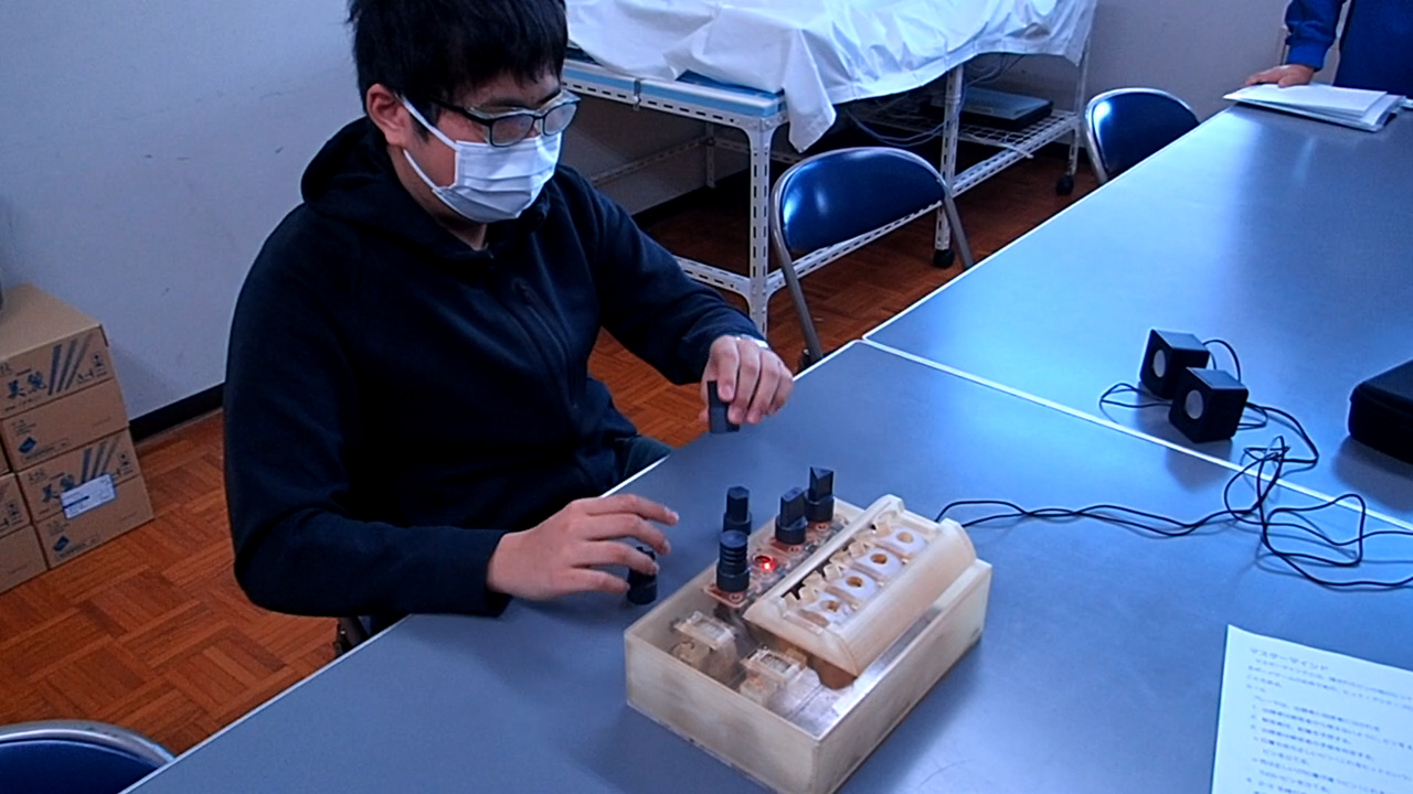 長野県長野盲学校のみなさんの協力のもと、目の不自由な方が一人で遊べるのはもちろん、ご家族やご友人と一緒に遊ぶことを考え、プレイヤーが使用するコマは全盲の方でも遊びやすい大きさ、判別しやすい形状を模索しました。さらに「丸」「三角形」「四角形」など、両者に共通でわかる呼び方を選び、統一しました。