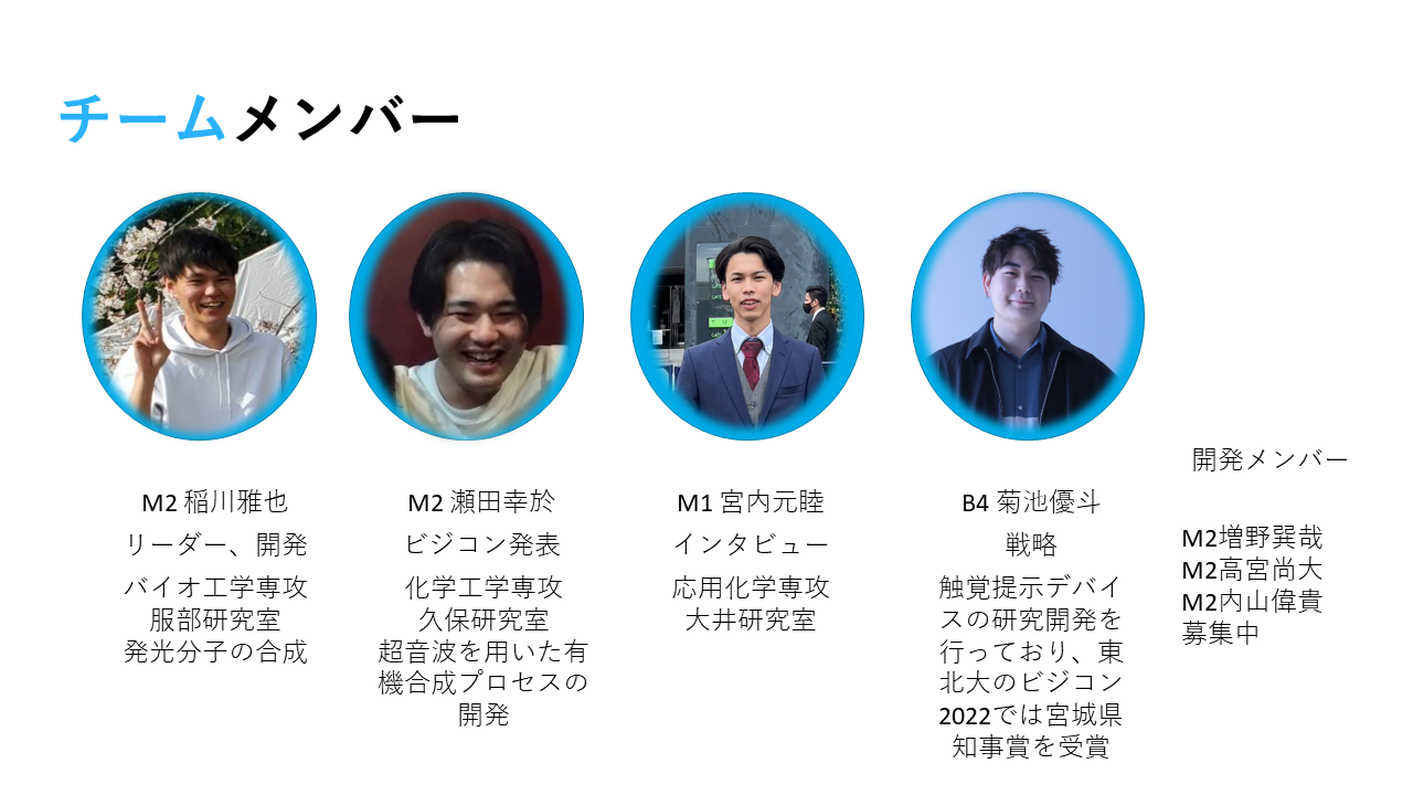 私たちのチームは,豊富なソフトウェア開発や自動化技術の経験をもとに大学の研究課題を解決するために結成されました。メンバーは化学の深い知識を持つ者、ロボットアームやハードウェア技術に精通した者で構成されています。この多様な経験と知識の組み合わせが、私たちの最大の強みとなっています。相互の専門性を活かしながら研究を効率化することで、日本の未来に貢献します。