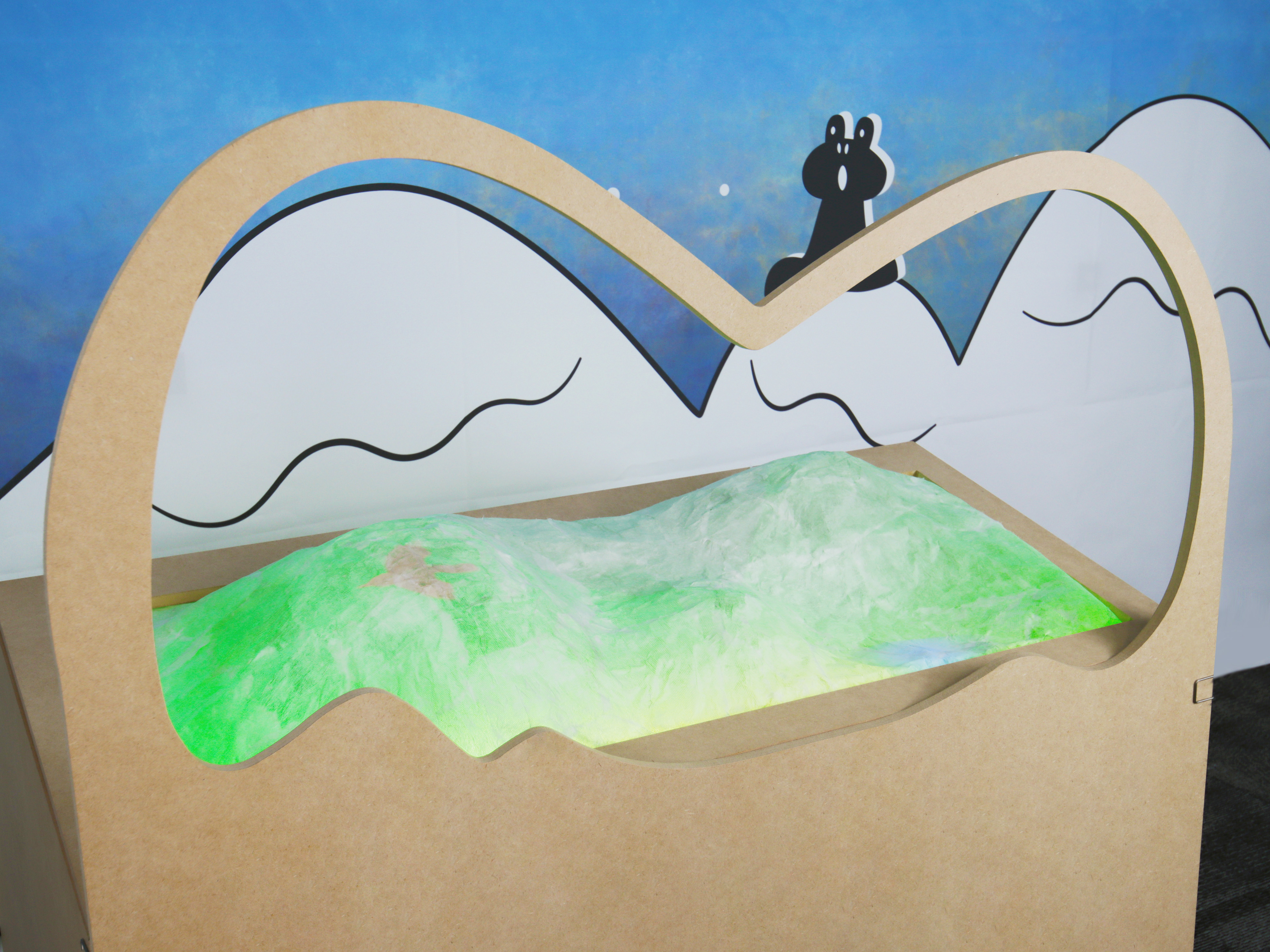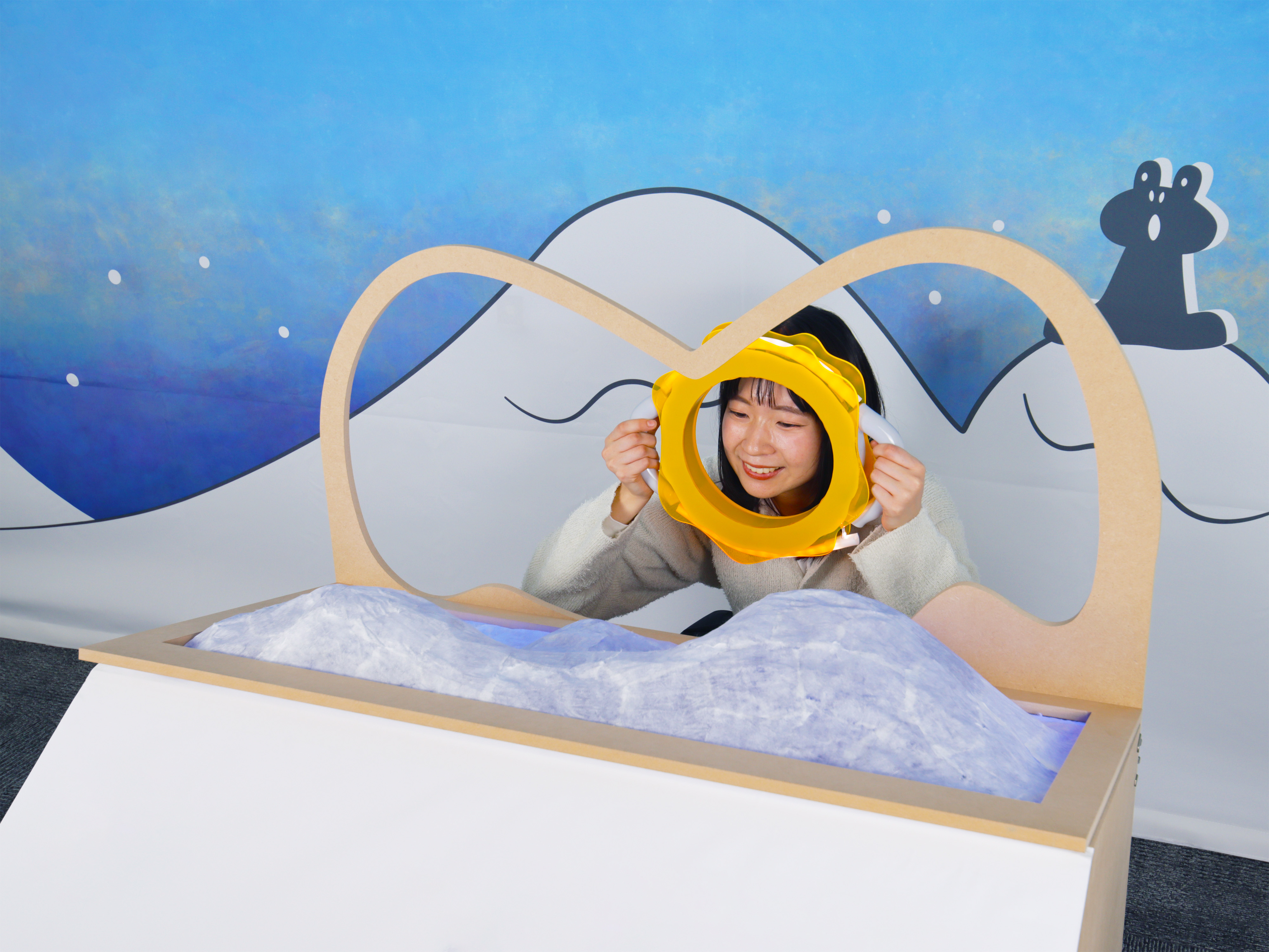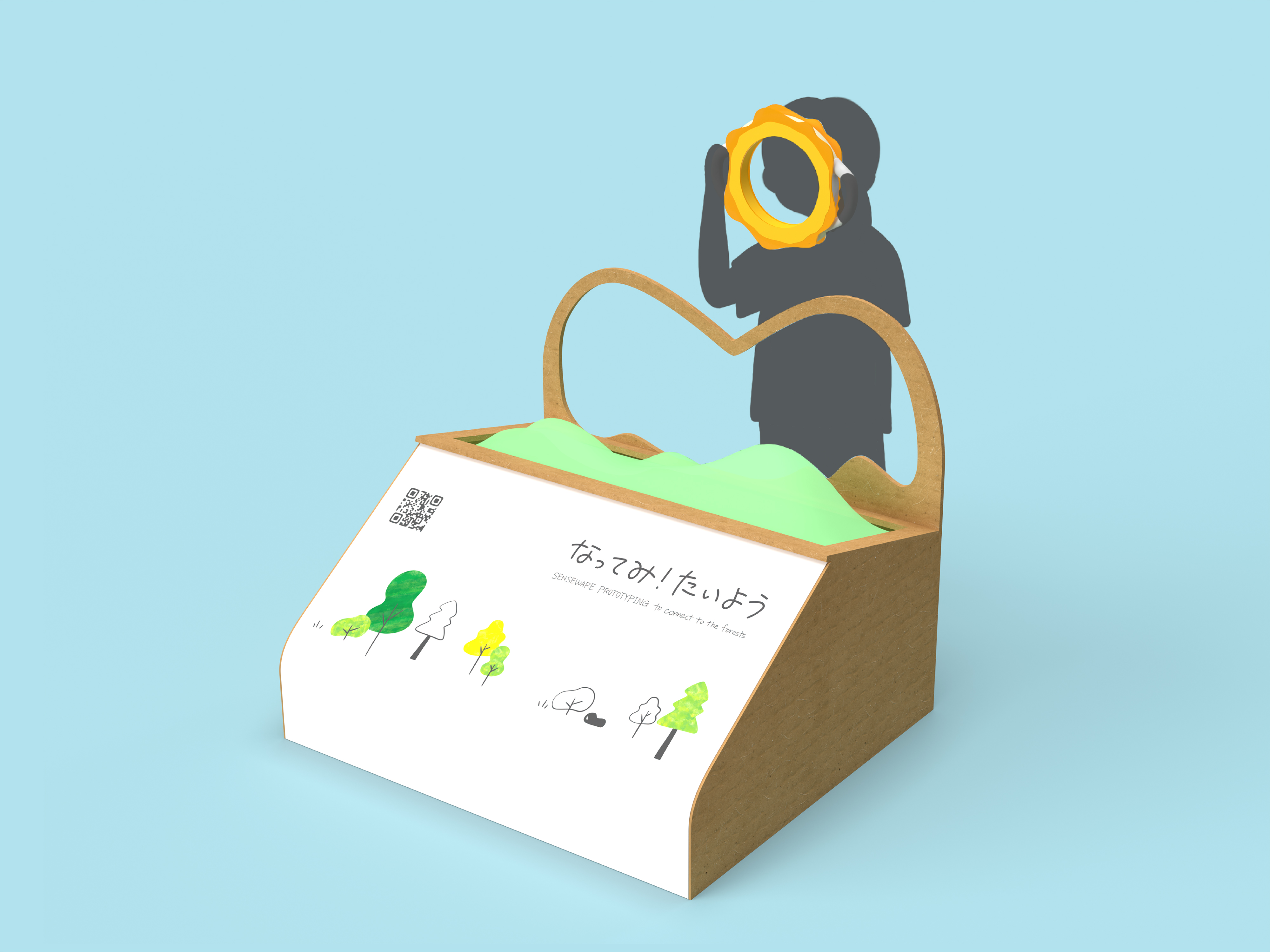 「なってみ!たいよう」は、スピーカー搭載の「たいようデバイス」と映像が投影される山型のジオラマで構成されています。体験者は「たいようデバイス」に顔をはめ込んで太陽になりきり、ジオラマの前で立ったりしゃがんだりします。ジオラマに備え付けられたカメラが体験者の顔の位置を検出し、立った姿勢は太陽が昇ったお昼の様子、しゃがむ姿勢は太陽が沈んだ夜の様子を表し、体験者がゆっくりと動くことで山型ジオラマの時間を操作することができます。ジオラマに投影される山の様子や、「たいようデバイス」から聞こえてくる自然の音、鳴き声のする生き物の種類が時間によって変化する様子を体感できるシステムです。