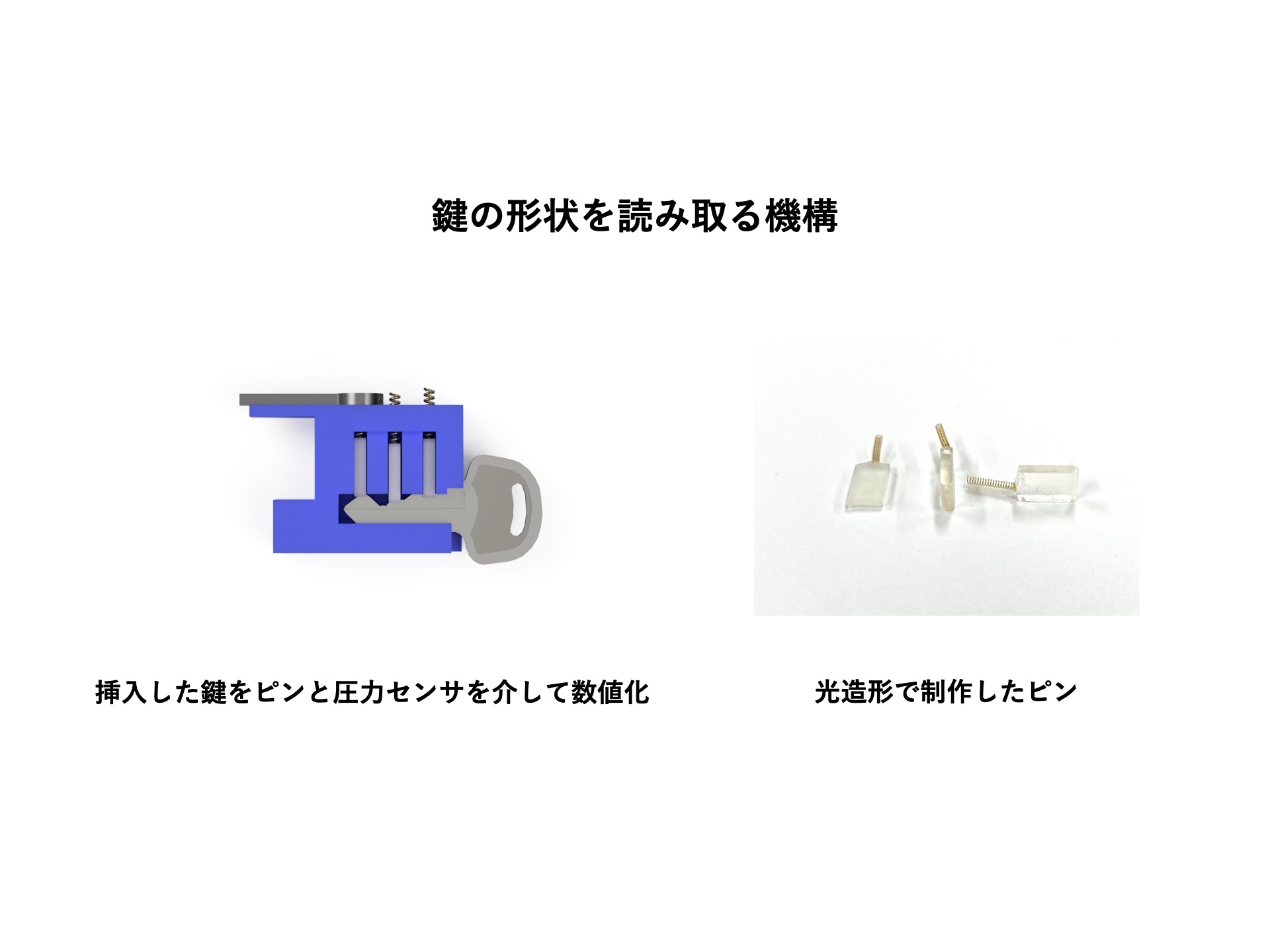 挿入された鍵凹凸に合わせて機構内のバネとピンの位置が変動し、圧力センサを通じて形状が数値化され、Arduinoがサウンドを再生します。