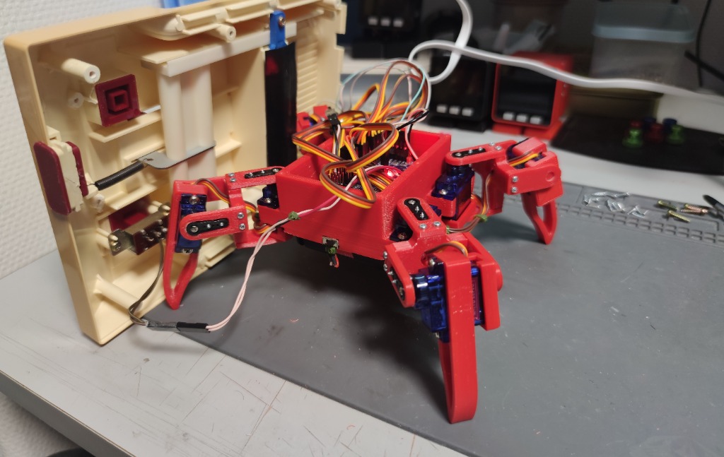 M5StickCとトイサーボ(SG92R)を使ったオープンソースの小型四脚歩行ユニットをファミコンに取り付けました。ファミコンコントローラを改造した専用無線コントローラで操作ができます。
